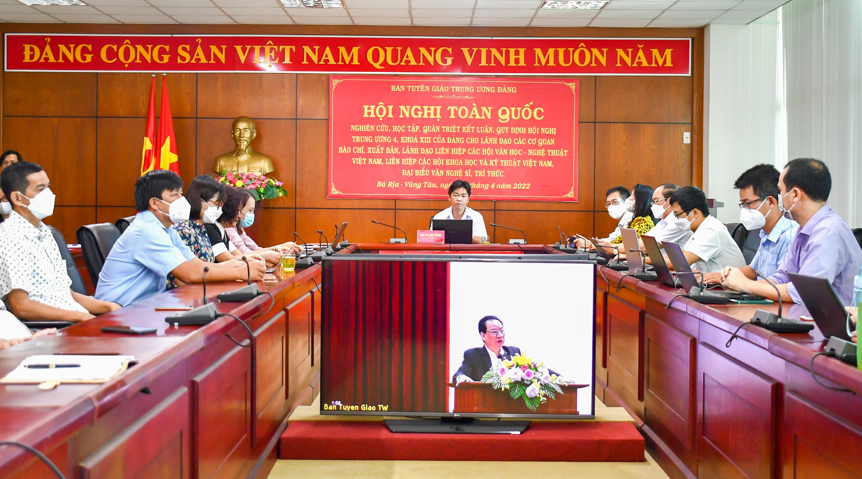 Sáng 21/4, Ban Tuyên giáo Trung ương đã tổ chức hội nghị trực tuyến toàn quốc nghiên cứu, học tập, quán triệt nội dung kết luận, quy định của Ban Chấp hành Trung ương Đảng lần thứ tư (khóa XIII) cho lãnh đạo các cơ quan báo chí, xuất bản, Liên hiệp các Hội VH-NT Việt Nam, Liên hiệp các hội KH-KT Việt Nam và đại biểu văn nghệ sĩ, trí thức.