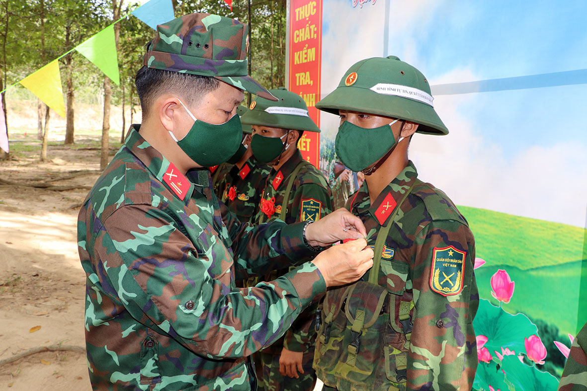 | Các chiến sĩ có thành tích tốt trong bài kiểm tra thực hành bắn súng được lãnh đạo Trung đoàn Minh Đạm cài hoa chúc mừng. |