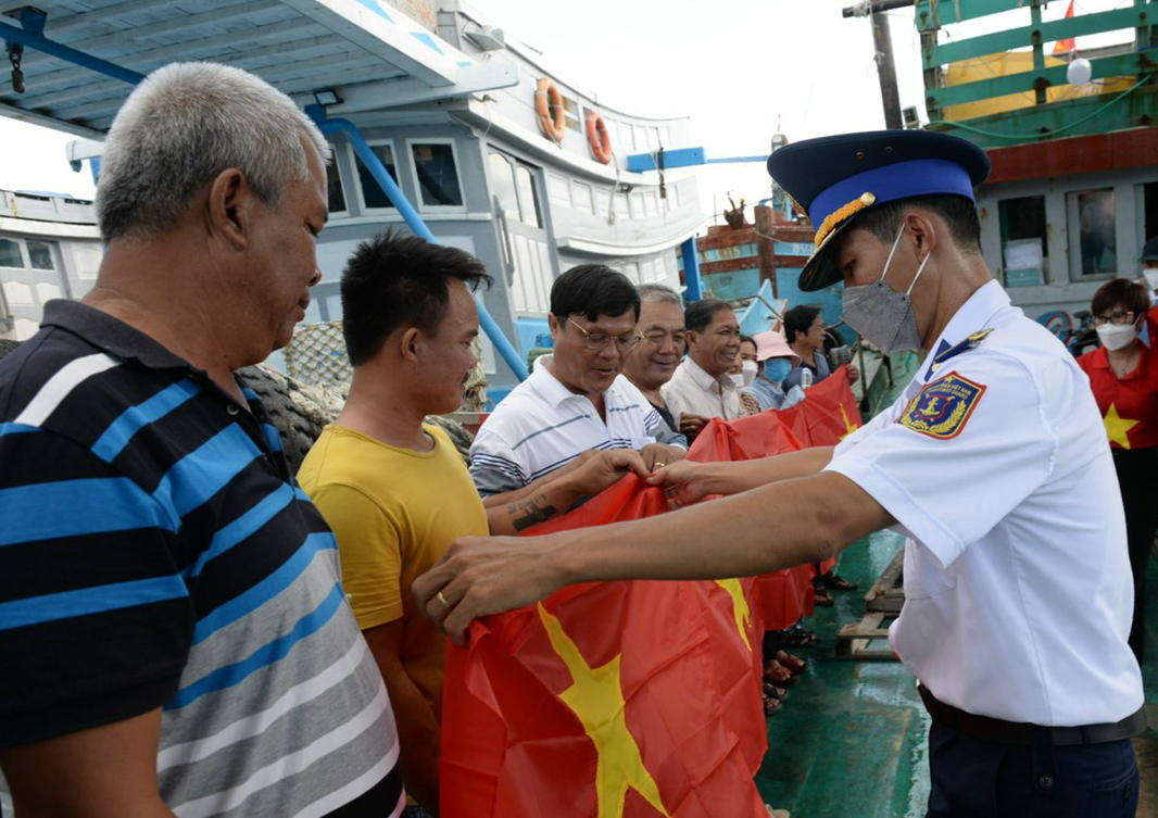 | Đại diện Bộ Tư lệnh Vùng Cảnh sát biển 3 tặng cờ Tổ quốc cho ngư dân huyện Long Điền. |