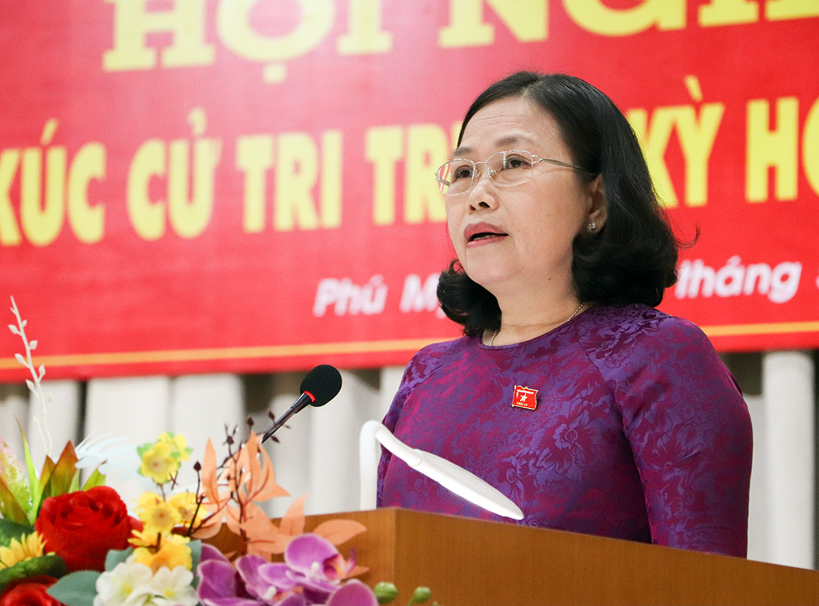 | Trưởng Đoàn ĐBQH tỉnh Nguyễn Thị Yến phát biểu tại buổi tiếp xúc cử tri TX. Phú Mỹ. Ảnh: QUANG VINH |