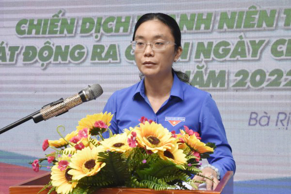 | Chị Hồ Thị Ánh Tuyết, Bí thư Tỉnh Đoàn phát biểu tại lễ ra quân chiến dịch Thanh niên tình nguyện hè. |