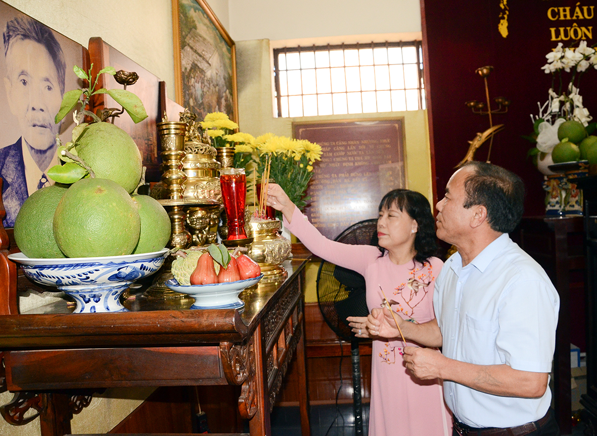| Ông Nguyễn Cảnh Phượng, Phó Tổng Biên tập Báo Lai Châu và bà Đỗ Nguyễn Hoàng Dung, Quyền Tổng Biên tập Báo Bà Rịa - Vũng Tàu dâng hương tại Đền thờ nữ Anh hùng liệt sĩ Võ Thị Sáu. Ảnh: BÙI CHIẾN. |