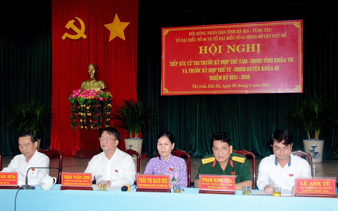 Tổ đại biểu số 6 HĐND tỉnh gồm: Ông Trần Tuấn Lĩnh, Ủy viên Ban Thường vụ, Trưởng Ban Nội chính Tỉnh ủy; ông Lê Văn Hòa, Bí thư Huyện ủy Đất Đỏ; ông Phạm Kinh Kha, Phó Chỉ huy trưởng Bộ CHQS tỉnh; ông Lê Anh Tú, Phó Giám đốc Sở TN-MT; bà Trần Thị Bạch Huệ, Phó Trưởng Ban Pháp chế HĐND tỉnh đã TXCT thị trấn Đất Đỏ và xã Long Tân, huyện Đất Đỏ (Ảnh trên).
