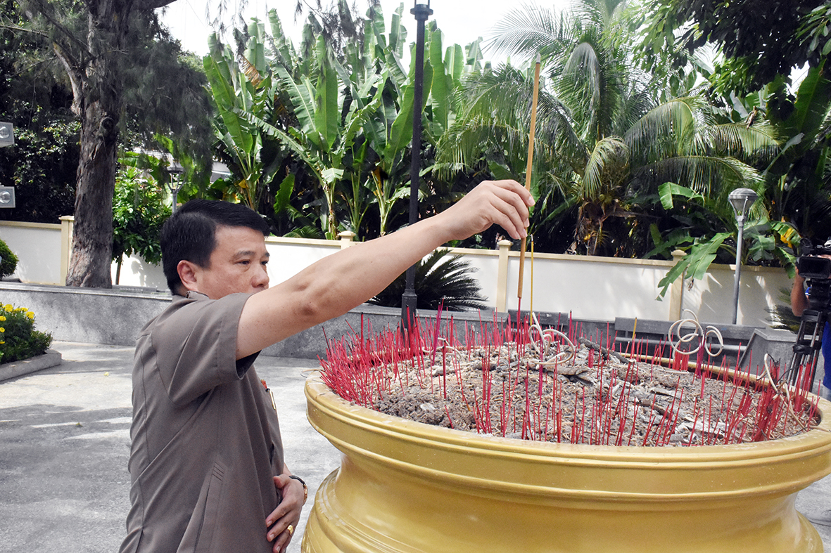 | Ông Y Thanh Hà Niê Kđăm dâng hương tại Đền thờ nữ Anh hùng liệt sĩ Võ Thị Sáu. |
