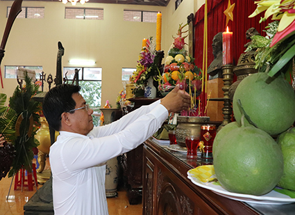 | Ông Huỳnh Văn Danh, Ủy viên Thường vụ Tỉnh ủy, Trưởng Ban Dân vận Tỉnh ủy dâng hương tưởng niệm các anh hùng liệt sĩ tại Đền thờ liệt sĩ xã Long Mỹ (huyện Đất Đỏ). Ảnh: VĂN ANH |