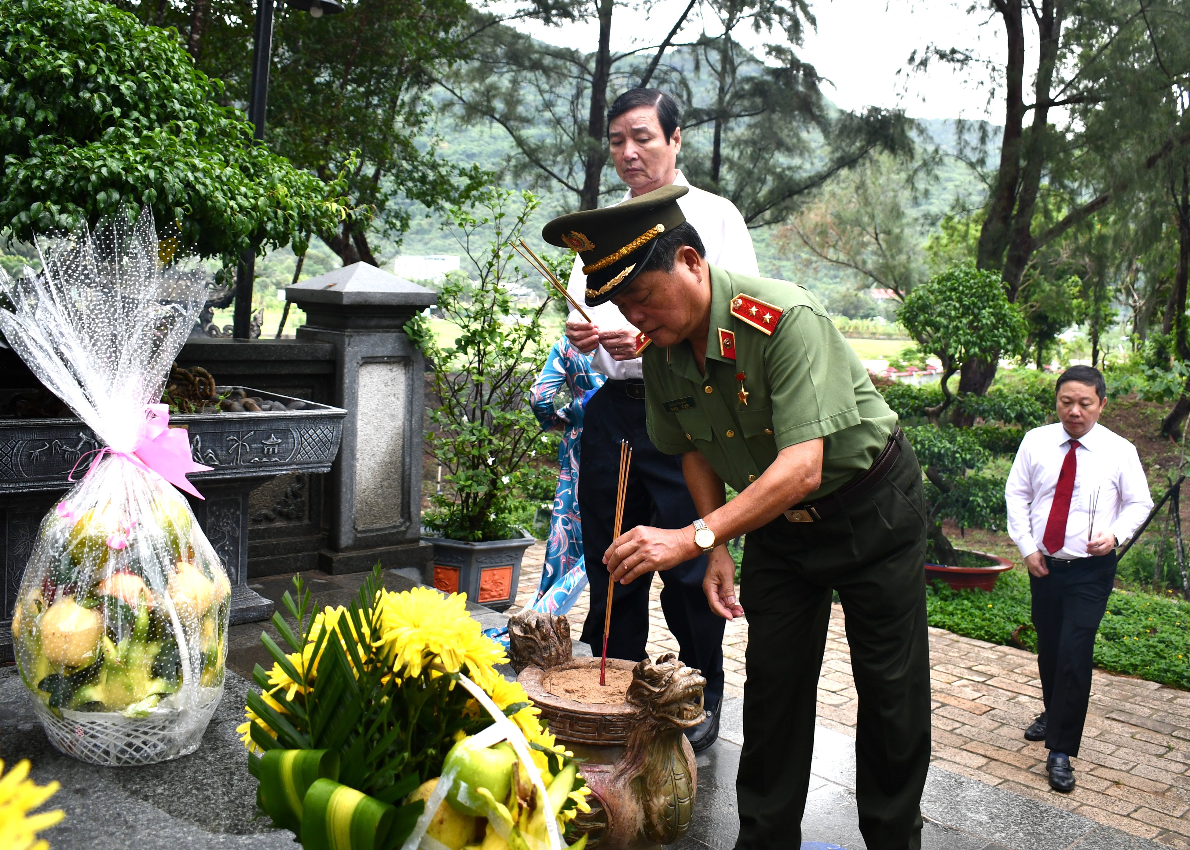 | Trung tướng, Anh hùng LLVTND Châu Văn Mẫn thắp hương trên phần mộ cố Tổng Bí thư Lê Hồng Phong. |