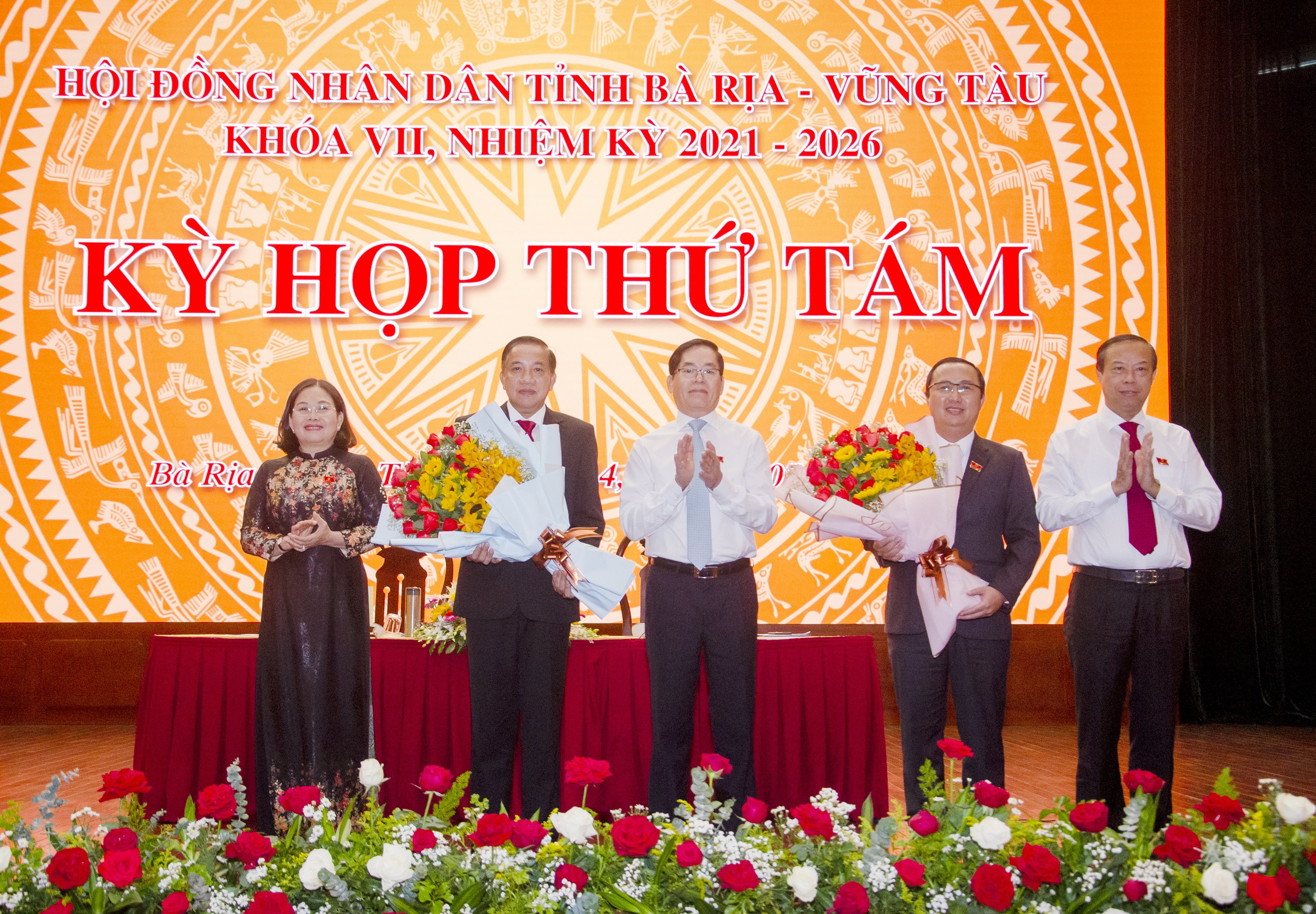 | Lãnh đạo Tỉnh ủy, UBND tỉnh tặng hoa chúc mừng ông Lê Hoàng Hải (thứ hai từ phải qua) giữ chức Phó Chủ tịch HĐND tỉnh và ông Trần Quốc Khánh (thứ 2 từ trái qua) được bầu bổ sung chức danh Ủy viên UBND tỉnh (Khóa VII, nhiệm kỳ 2021-2026). |