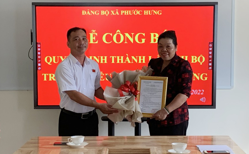 | Ông Kiều Minh Sơn, Bí thư Đảng ủy xã Phước Hưng trao quyết định thành lập Chi bộ cho bà Hoàng Thị Diệu Hằng, Hiệu trưởng, Bí thư Chi bộ Trường TH Phước Hưng. |
