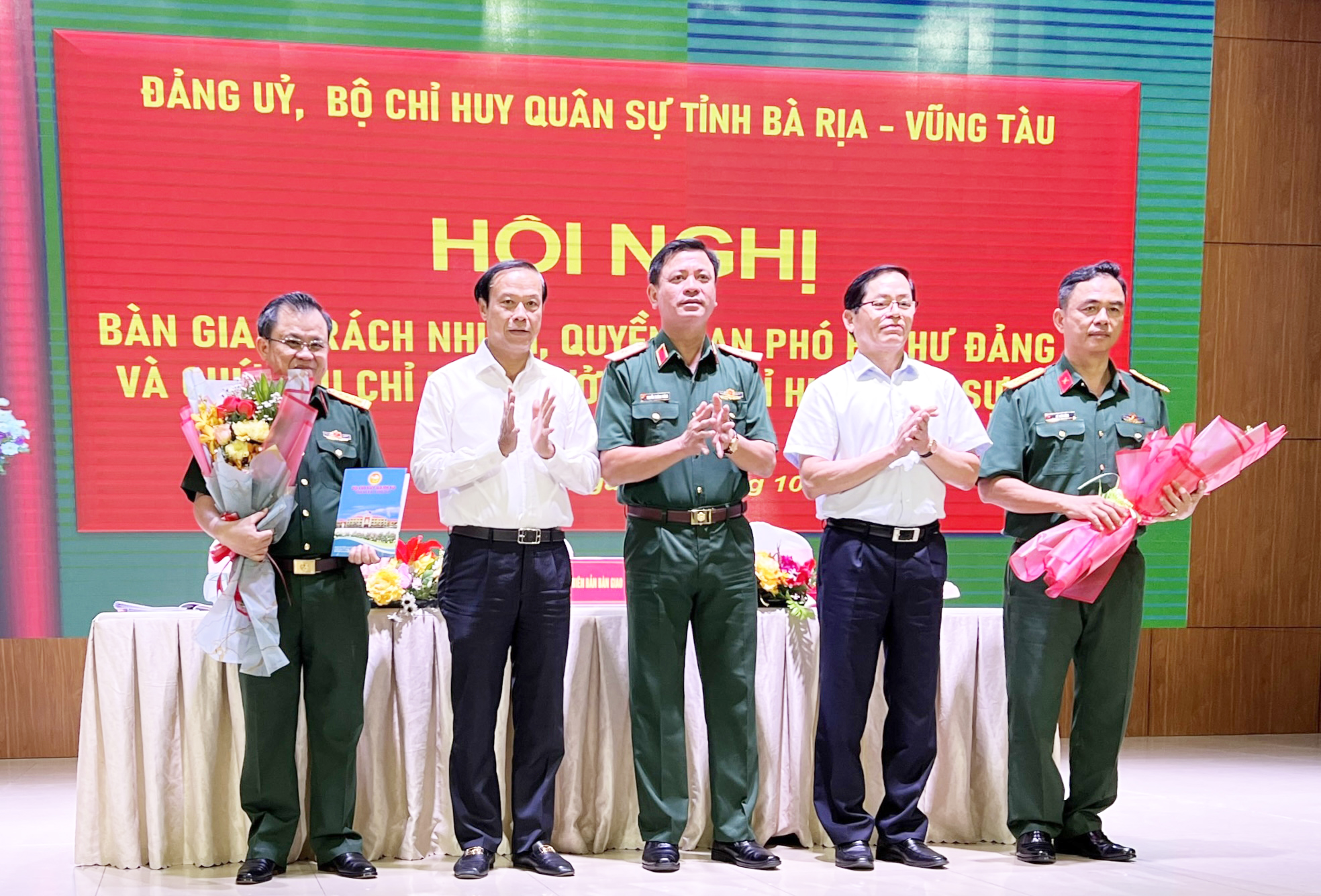 | Lãnh đạo Quân khu 7 và tỉnh Bà Rịa-Vũng Tàu tặng hoa và trao quyết định đến Đại tá Nguyễn Tâm Hùng và Đại tá Lê Xuân Bình. |
