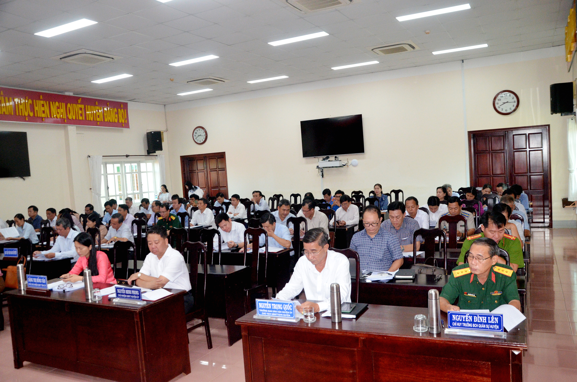 | Các ông (từ trái sang): Huỳnh Sơn Thái, Phó Bí thư Huyện ủy, Chủ tịch UBND tỉnh; Nguyễn Công Danh, Bí thư Huyện ủy; Trần Thanh Hùng, Phó Bí thư Thường trực Huyện ủy, chủ tọa hội nghị. |