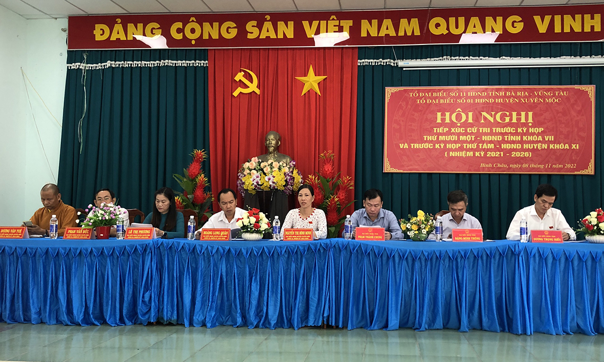 Tổ Đại biểu số 11 HĐND tỉnh (ảnh dưới) gồm: ông Đặng Minh Thông, Uỷ viên Ban thường vụ Tỉnh ủy, Phó Chủ tịch UBND tỉnh; ông Dương Trọng Hiếu, Chánh Văn phòng Tỉnh ủy; ông Phạm Thành Chung, Bí thư Huyện ủy, Chủ tịch HĐND huyện Xuyên Mộc; ông Trần Mạnh Đức, Phó Trưởng Ban Kinh tế - Ngân sách HĐND tỉnh đã TXCT xã Bình Châu (huyện Xuyên Mộc).