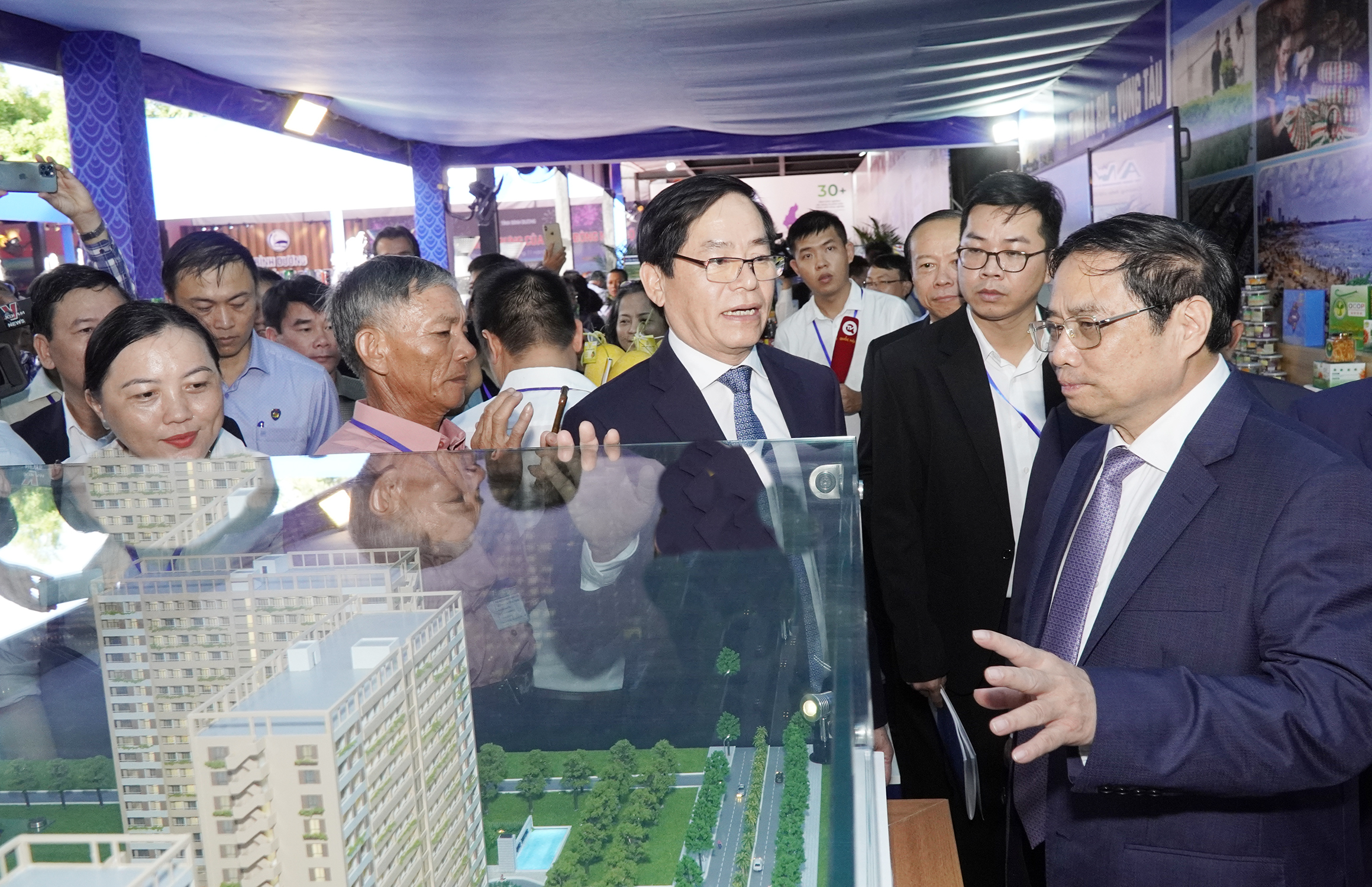| Lãnh đạo tỉnh Bà Rịa - Vũng Tàu giới thiệu với Thủ tướng về hệ thống nhà ở xã hội qua sa bàn tại gian triển lãm của tỉnh. |