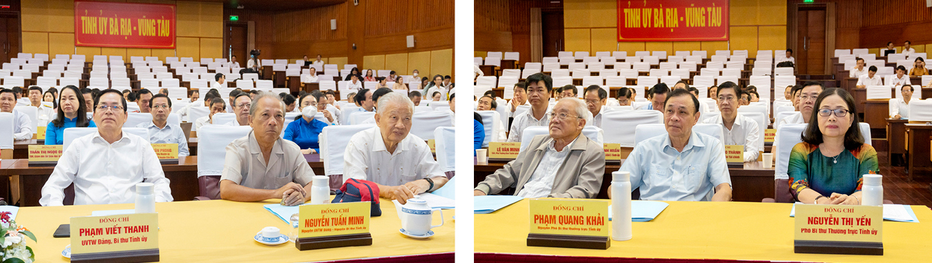 | Bí thư Tỉnh ủy Phạm Viết Thanh, Phó Bí thư Thường trực Tỉnh ủy Nguyễn Thị Yến và nguyên lãnh đạo Tỉnh ủy qua các thời kỳ dự hội nghị. Ảnh: Mạnh Thắng |
