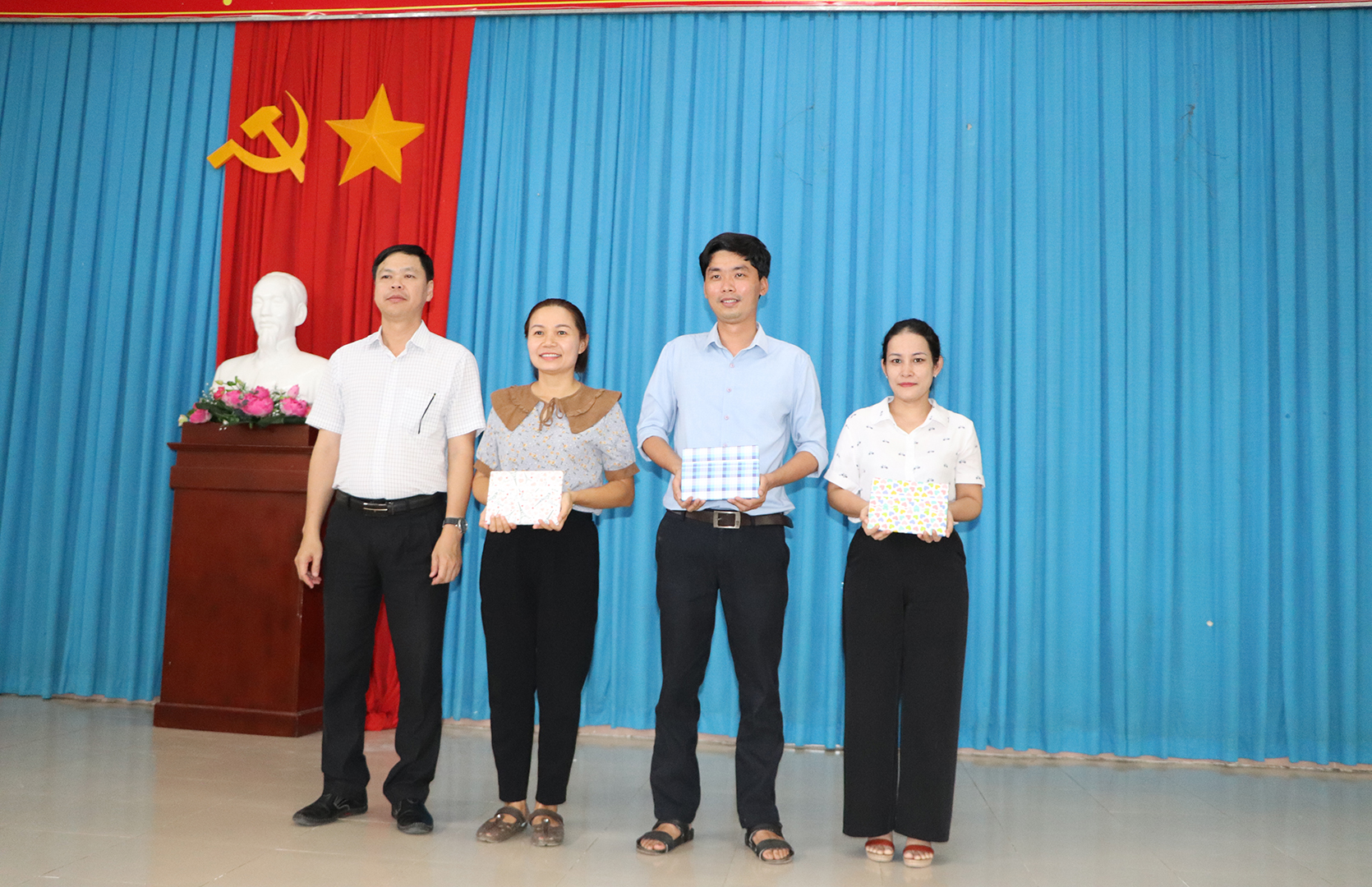 | Ông Ngô Thanh Phúc, Bí thư Đảng ủy thị trấn Long Hải khen thưởng đảng viên tiêu biểu của Chi bộ Trường THCS Nguyễn Công Trứ. |
