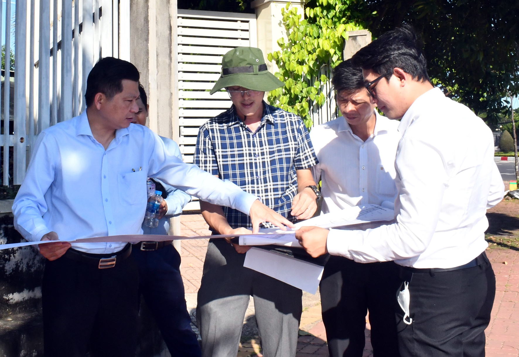 | Bí thư Thành ủy Bà Rịa Trần Văn Tuấn (bìa trái) khảo sát tiến độ thực hiện công tác kiểm đếm, đo đạc dự án đầu tư xây dựng đường bộ cao tốc Biên Hòa-Vũng Tàu (giai đoạn 1) tại địa phận xã Hòa Long (TP. Bà Rịa). Ảnh: HUYỀN TRANG |