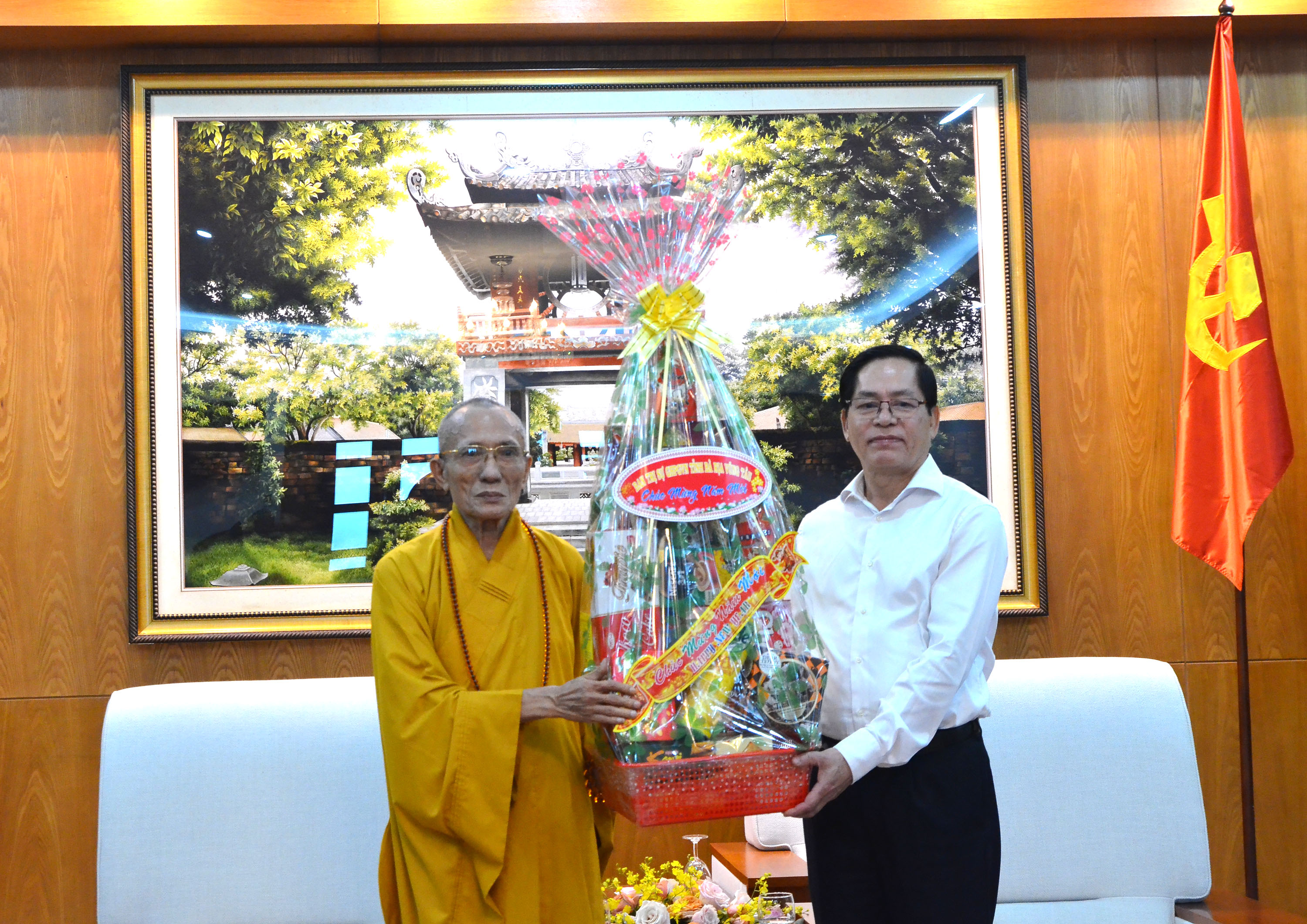| Hòa thượng Thích Huệ Trí, Trưởng Ban Trị sự Giáo hội Phật giáo Việt Nam tỉnh tặng quà chúc Tết Bí thư Tỉnh ủy Phạm Viết Thanh. |