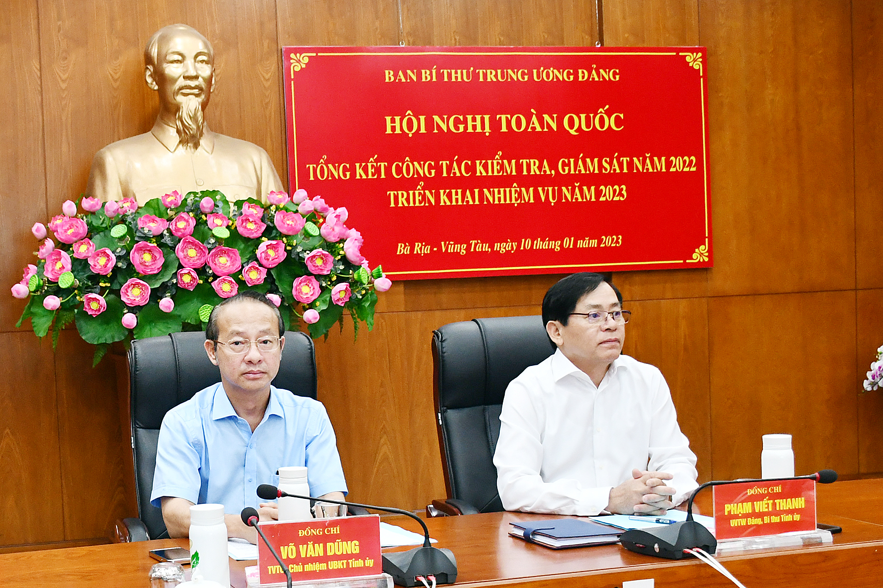 Ông Phạm Viết Thanh, Ủy viên Trung ương Đảng, Bí thư Tỉnh ủy, Chủ tịch HĐND tỉnh và ông Võ Văn Dũng, Ủy viên Ban Thường vụ Tỉnh ủy, Chủ nhiệm UBKT Tỉnh ủy tham dự hội nghị tại điểm cầu Tỉnh ủy Bà Rịa-Vũng Tàu (ảnh dưới).