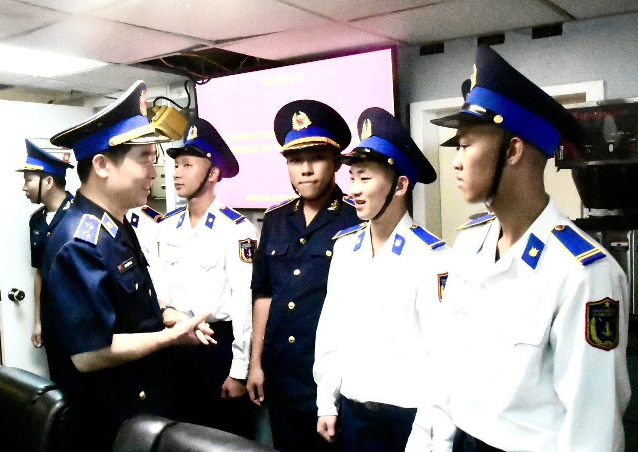 | Trung tướng Bùi Quốc Oai (bên trái), Chính ủy Cảnh sát biển Việt Nam động viên tinh thần cán bộ, chiến sĩ Hải đoàn 32. |