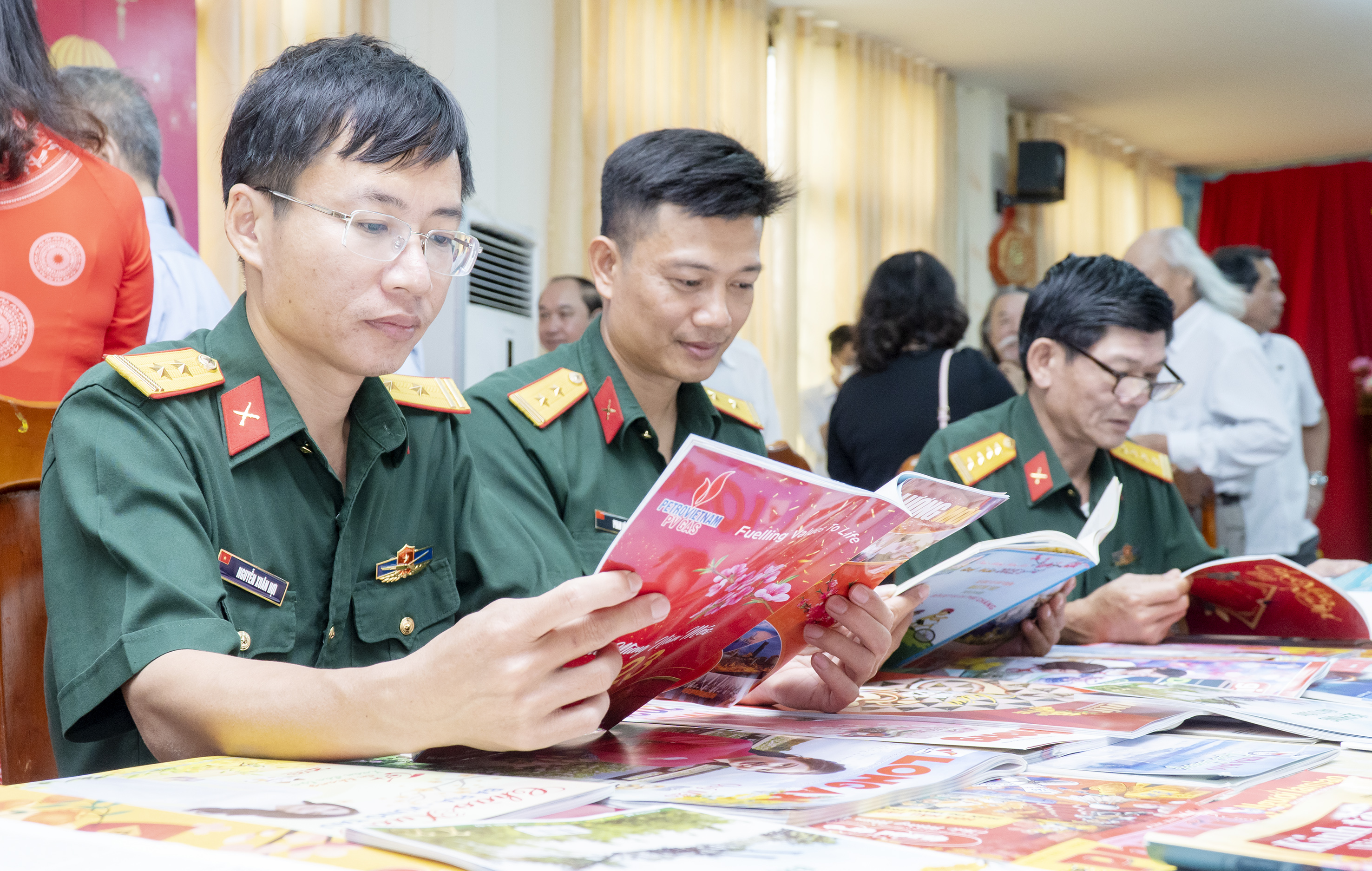 | Cán bộ, chiến sĩ lực lượng vũ trang đọc ác ấn phẩm Xuân tại Hội báo Xuân Quý Mão 2023. |