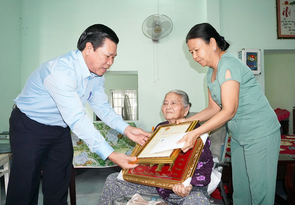 | Ông Nguyễn Văn Xinh, Ủy viên Ban Thường vụ Tỉnh ủy, Trưởng Ban Tuyên giáo Tỉnh ủy chúc thọ 100 tuổi Mẹ Việt Nam Anh hùng Lương Thị Chính (ấp Lò Vôi, xã Phước Hưng, huyện Long Điền).Ảnh: QUANG VINH |