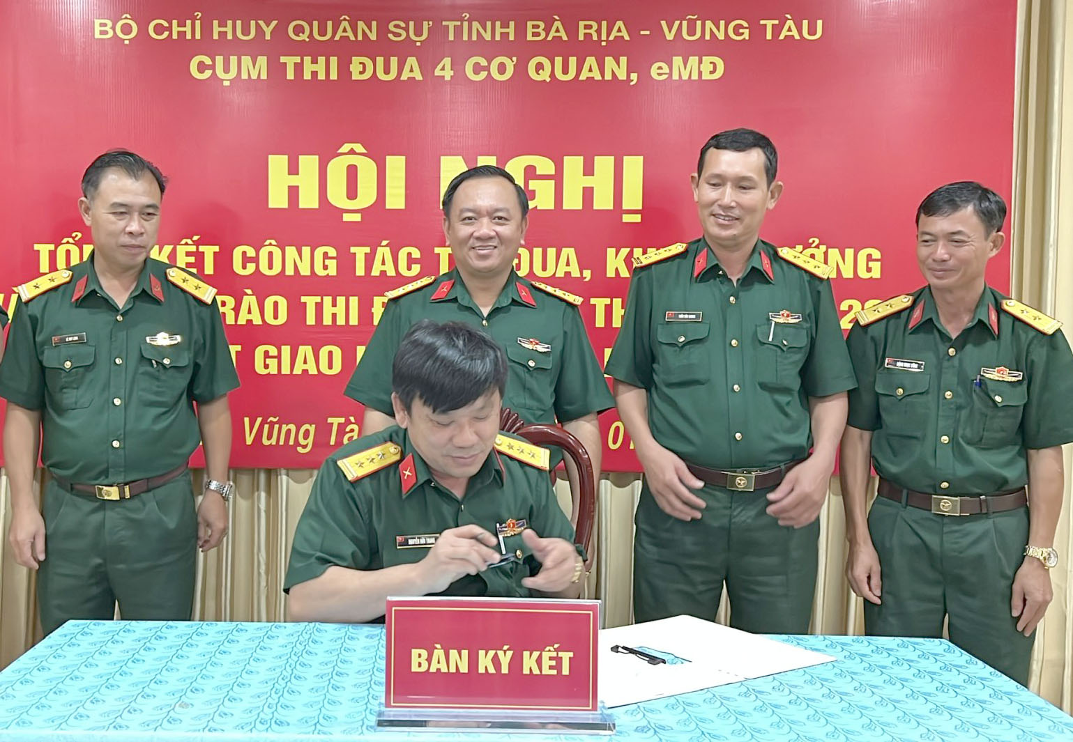 | Đại diện các cơ quan Bộ CHQS tỉnh và Trung đoàn Minh Đạm ký kết giao ước thi đua năm 2023. |
