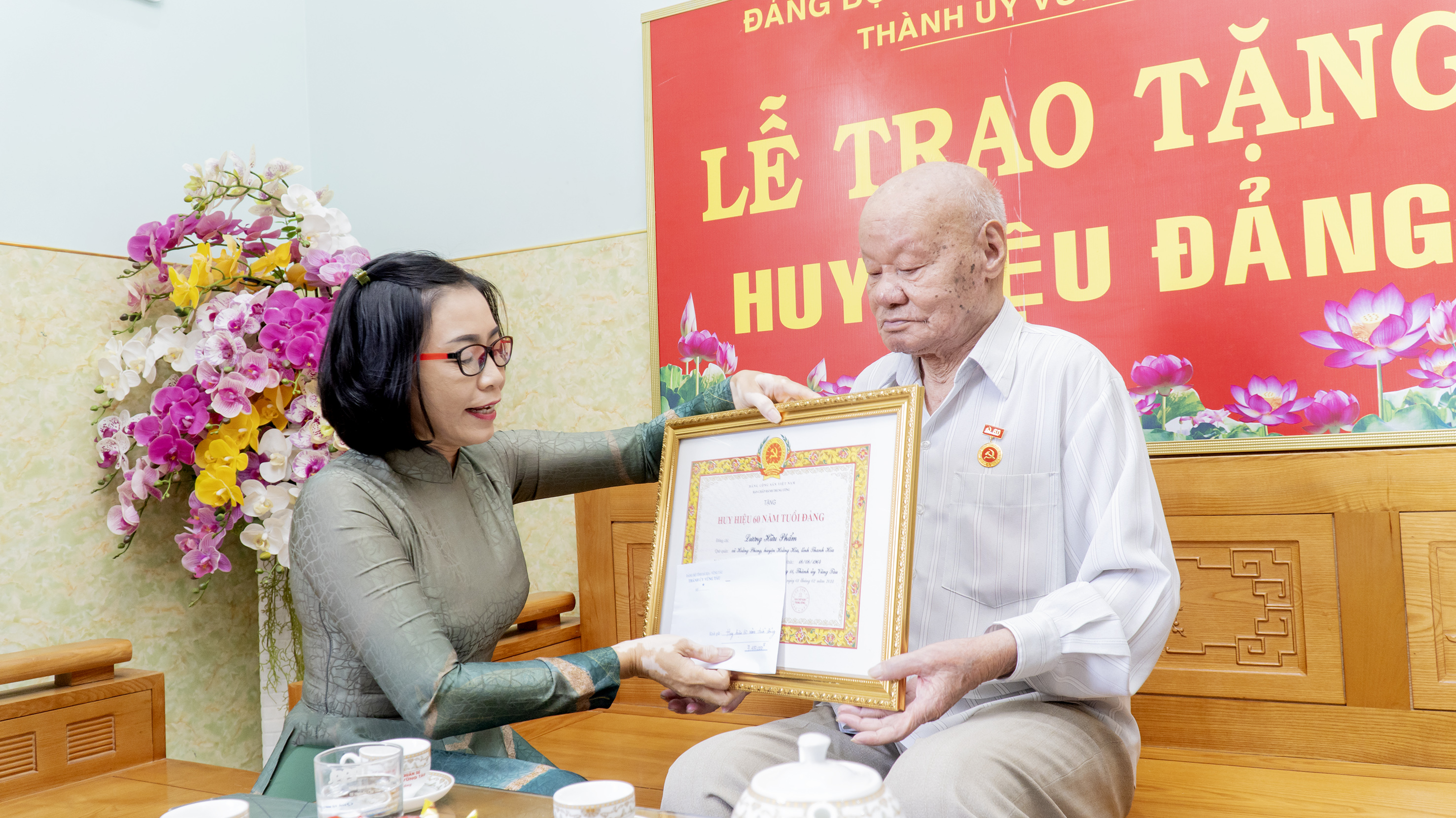 | Bà Lê Thị Thanh Bình, Phó Bí thư Thường trực Thành ủy, Chủ tịch HĐND TP. Vũng Tàu trao Huy hiệu 60 năm tuổi Đảng cho đảng viên Lương Hữu Phẩm (đảng viên Chi bộ 3, Đảng bộ phường 11). |
