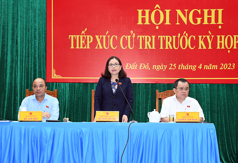 Tiếp tục chương trình tiếp xúc cử tri (TXCT) trước Kỳ họp thứ Năm, Quốc hội khóa XV, ngày 25/4, Đoàn ĐBQH tỉnh gồm các đại biểu: Nguyễn Thị Yến, Phó Bí thư Thường trực Tỉnh ủy, Trưởng Đoàn ĐBQH tỉnh; Chuẩn đô đốc Đỗ Văn Yên, Phó Chính ủy Quân chủng Hải quân; Đại tá Nguyễn Tâm Hùng đã TXCT huyện Đất Đỏ.