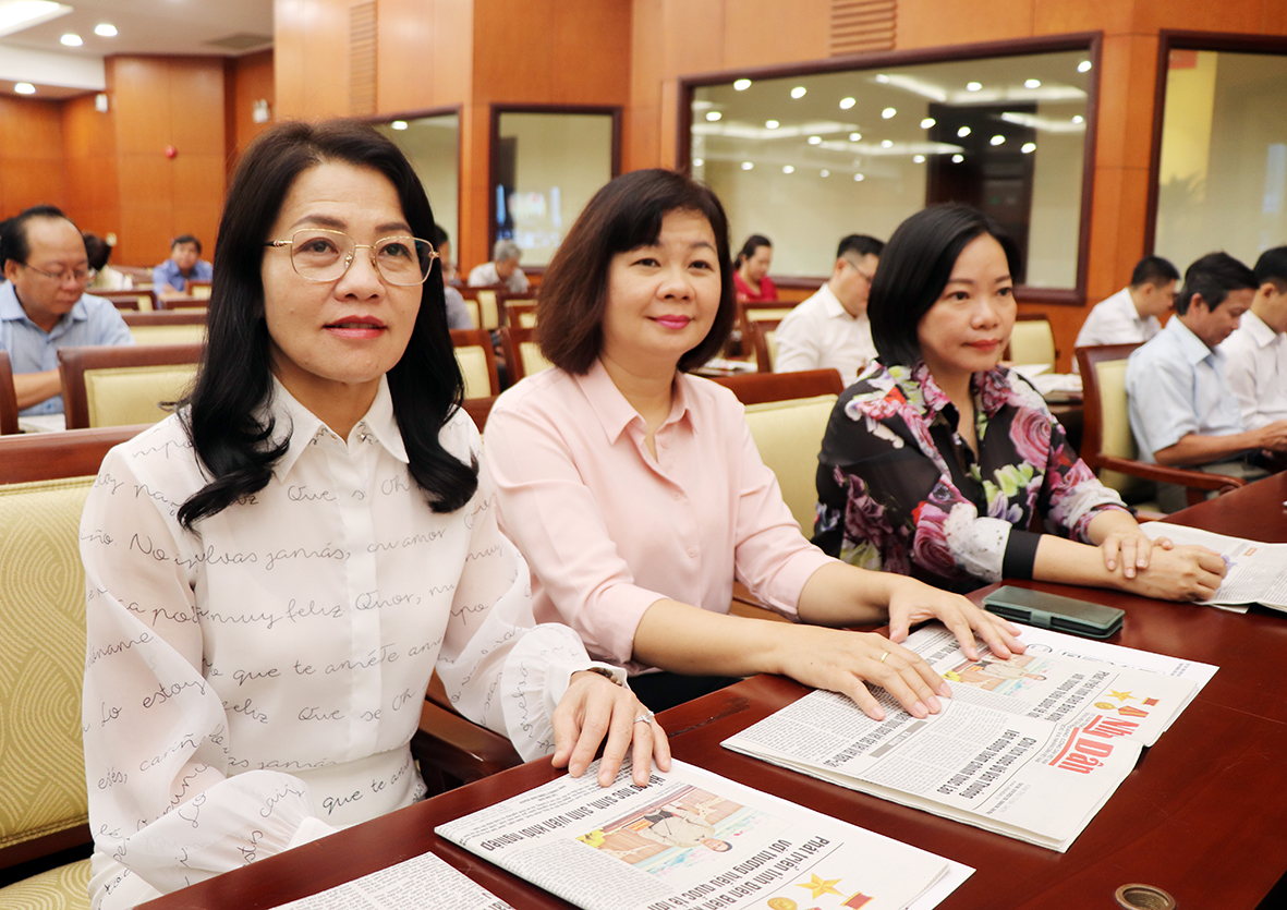 Đồng chủ trì hội nghị có các ông: Lê Quốc Minh, Ủy viên Trung ương Đảng, Tổng Biên tập Báo Nhân dân; Nguyễn Văn Hiếu, Ủy viên Dự khuyết Trung ương Đảng, Phó Bí thư Thành ủy TP. Hồ Chí Minh; Nguyễn Ngọc Hà, Phó Tổng Biên tập Tạp chí Cộng sản.