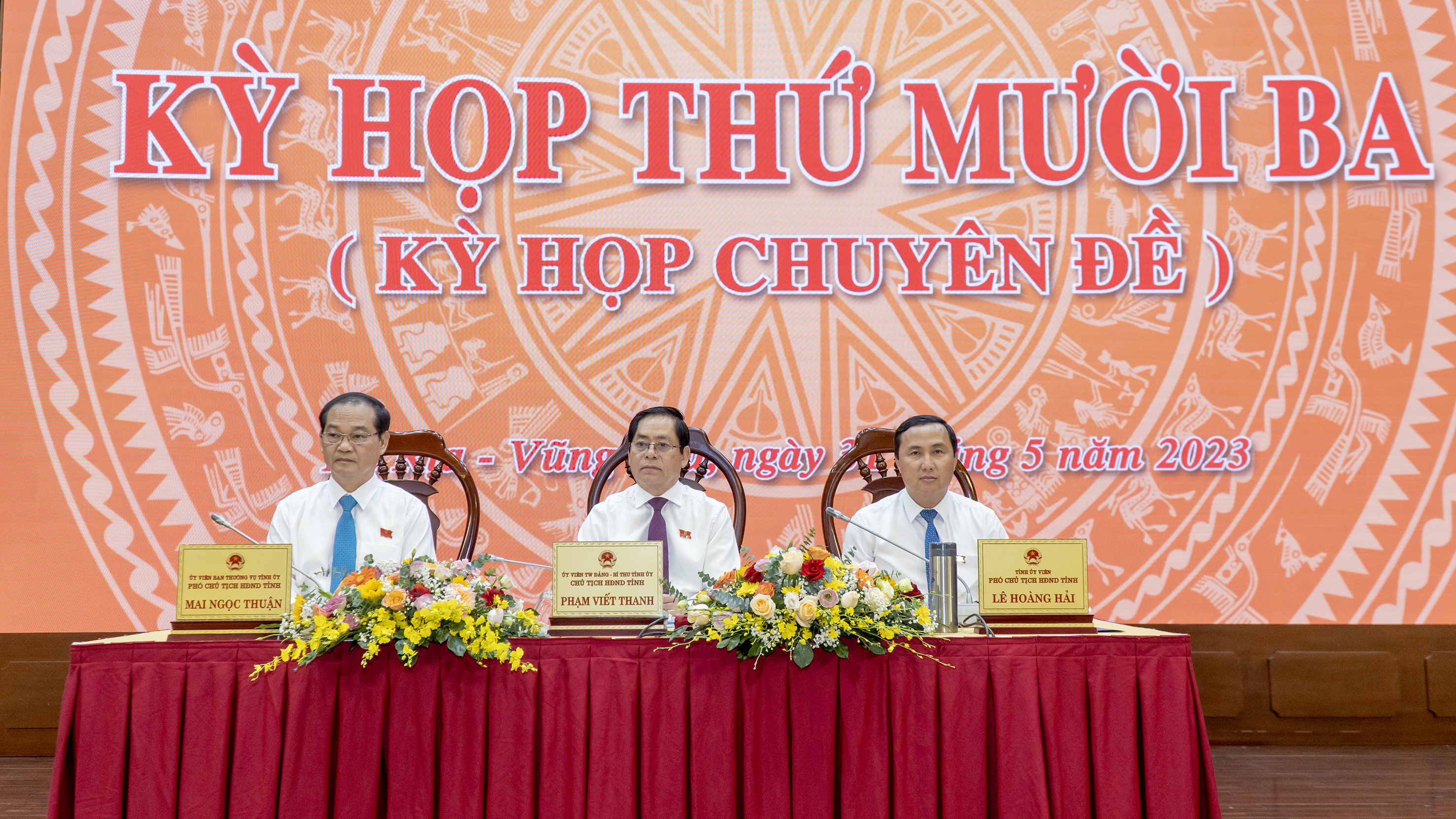 Ông Phạm Viết Thanh, Ủy viên Trung ương Đảng, Bí thư Tỉnh ủy, Chủ tịch HĐND tỉnh; ông Mai Ngọc Thuận, Ủy viên Ban Thường vụ Tỉnh ủy, Phó Chủ tịch HĐND; ông Lê Hoàng Hải, Phó Chủ tịch HĐND tỉnh, chủ tọa Kỳ họp.