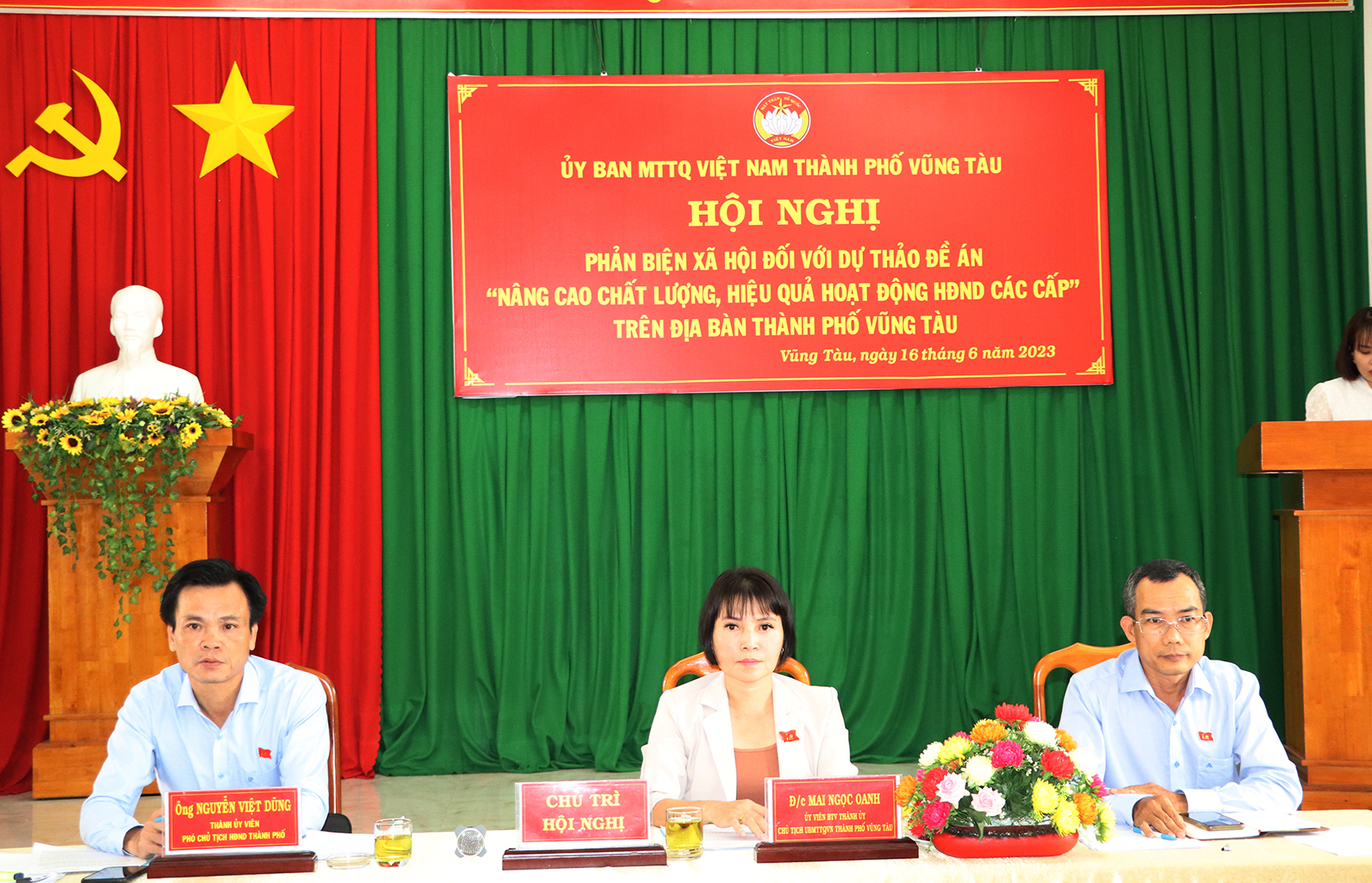 | Bà Mai Ngọc Oanh, Chủ tịch UBMTTQ Việt Nam TP.Vũng Tàu; ông Nguyễn Việt Dũng, Phó Chủ tịch HĐND TP.Vũng Tàu và ông Phạm Tuấn Anh, Phó Chủ tịch UBMTTQ Việt Nam thành phố chủ trì hội nghị. |