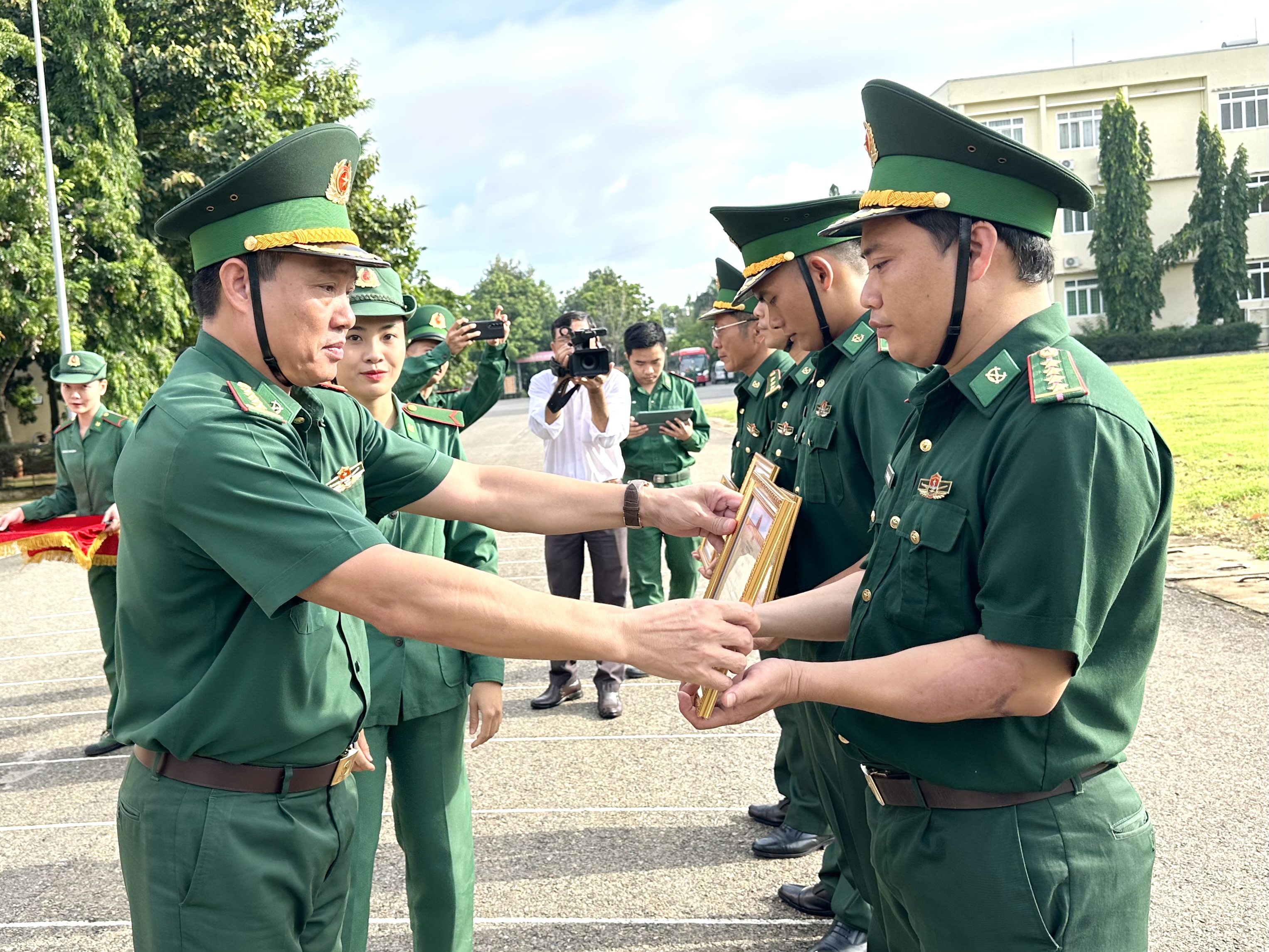 | Đại tá Nguyễn Xuân Toàn, Phó Hiệu trưởng Quân sự Trường CĐ Biên phòng (phụ trách cơ sở 2) trao Giấy khen cho các tập thể có thành tích tốt trong huấn luyện chiến sĩ mới. |