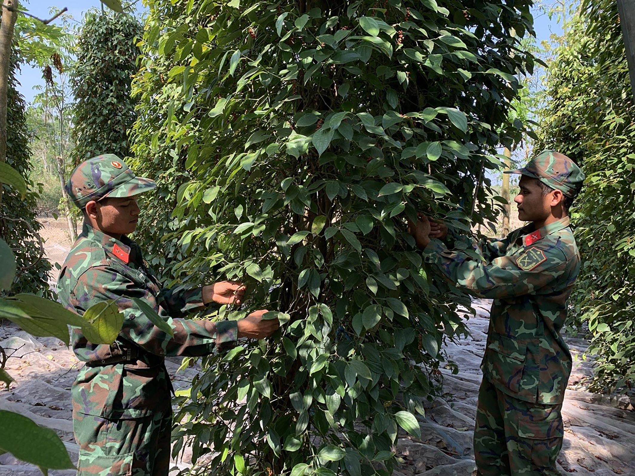 | Cán bộ, chiến sĩ LLVT tỉnh và Sư đoàn 302 giúp nông dân huyện Châu Đức thu hoạch tiêu. |