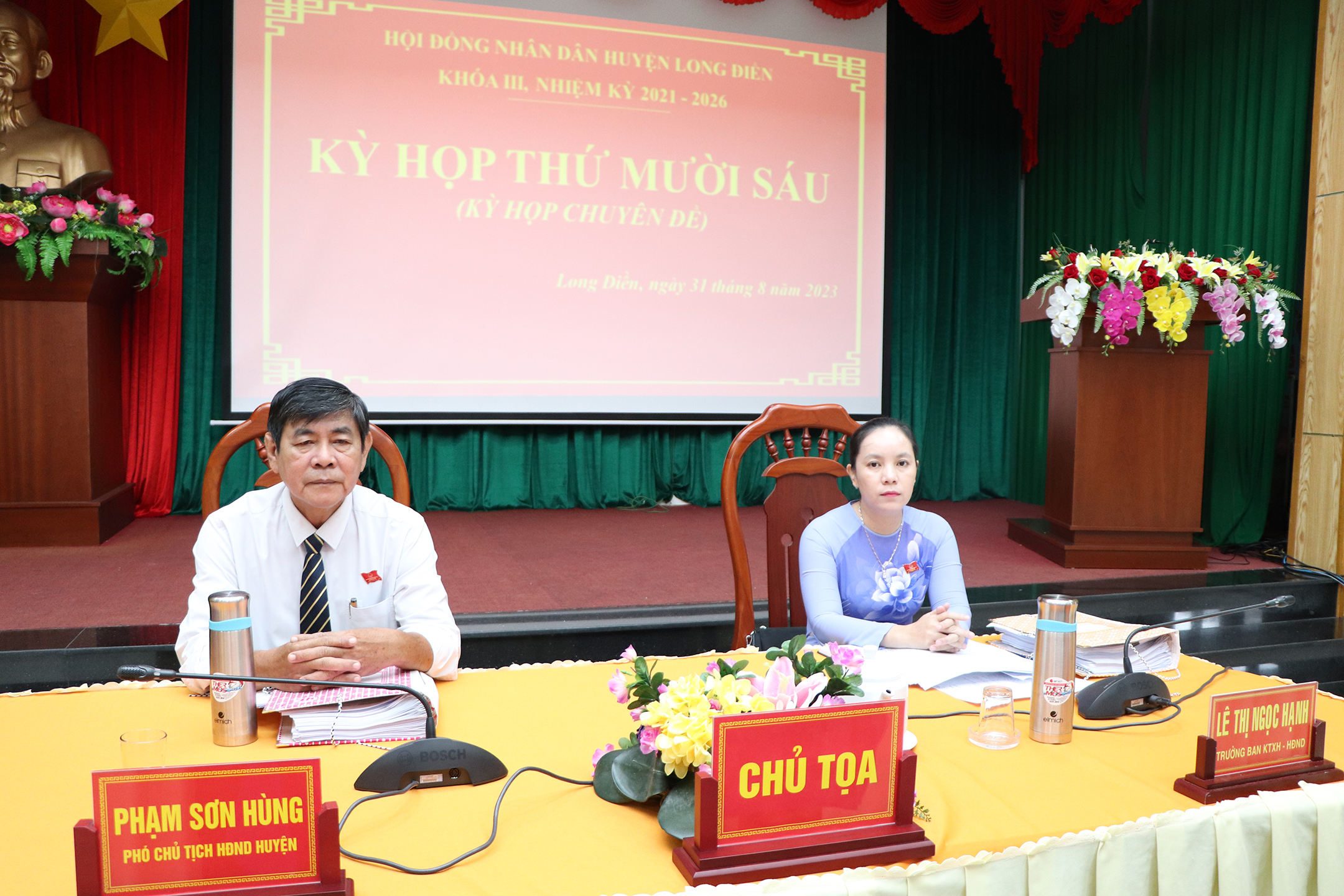 | Ông Phạm Sơn Hùng, Phó Chủ tịch HĐND huyện; bà Lê Thị Ngọc Hạnh, Trưởng Ban Tuyên giáo Huyện ủy, Trưởng Ban Kinh tế-Xã hội HĐND huyện đồng chủ tọa kỳ họp. |