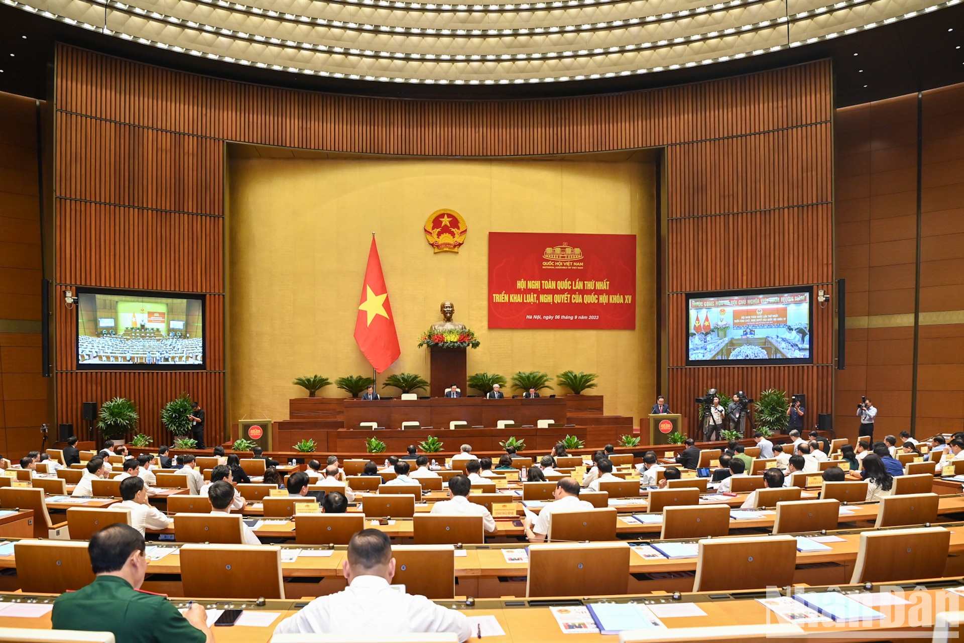 | Hội nghị toàn quốc lần thứ nhất triển khai luật, nghị quyết của Quốc hội khóa XV để quán triệt và triển khai các luật, nghị quyết được thông qua tại Kỳ họp thứ 5, đồng thời đánh giá việc thực hiện các luật, nghị quyết được Quốc hội ban hành từ đầu nhiệm kỳ đến hết Kỳ họp thứ 4. Ảnh: Báo NHÂN DÂN. |