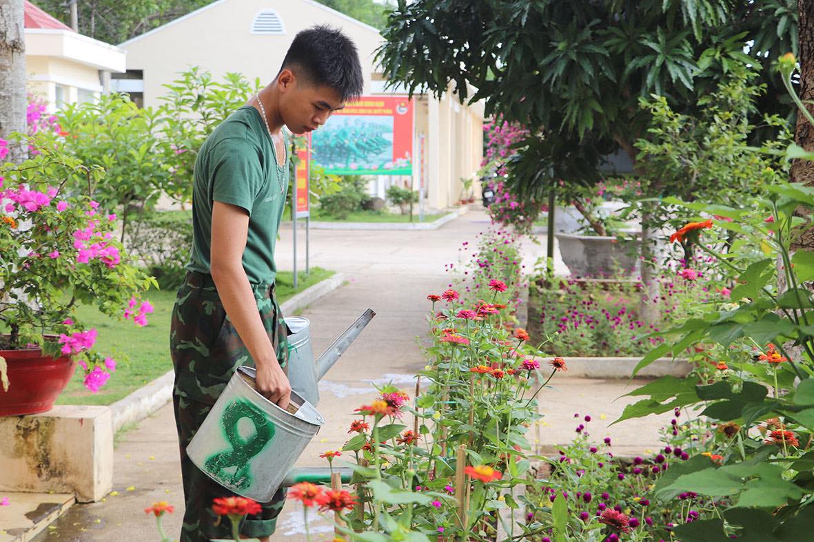 | Chiến sĩ Trung đoàn Minh Đạm chăm sóc cây trong doanh trại. |