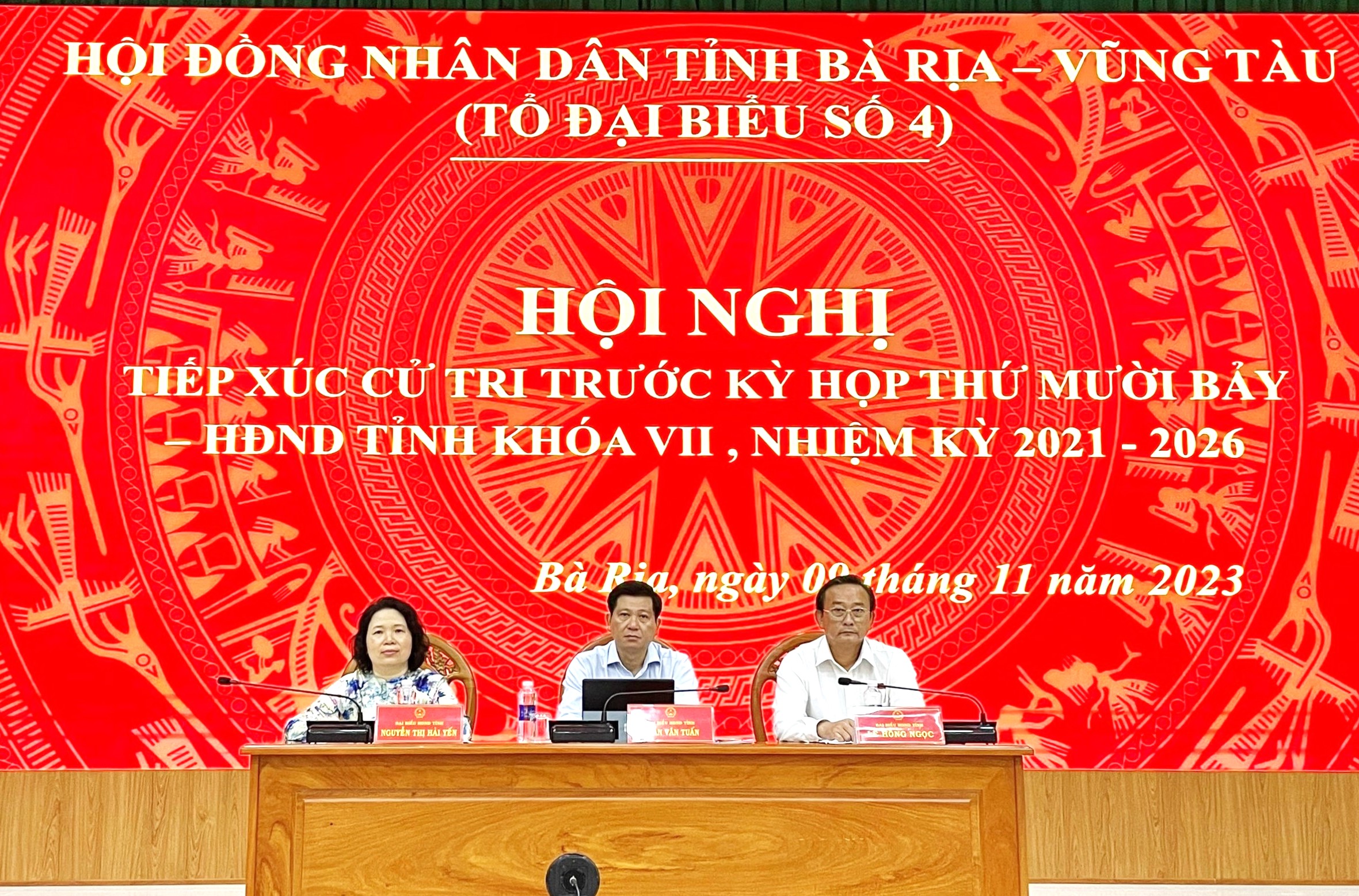 Tại các hội nghị tiếp xúc, đại biểu HĐND tỉnh thông tin đến cử tri dự kiến chương trình, nội dung Kỳ họp thứ 17; Báo cáo tình hình thực hiện nhiệm vụ phát triển kinh tế - xã hội, quốc phòng - an ninh 9 tháng đầu năm, ước thực hiện cả năm 2023 và phương hướng, nhiệm vụ trọng tâm phát triển kinh tế - xã hội năm 2024 của tỉnh Bà Rịa - Vũng Tàu; kết quả giải quyết ý kiến, kiến nghị của cử tri trước Kỳ họp thứ 14, HĐND tỉnh.