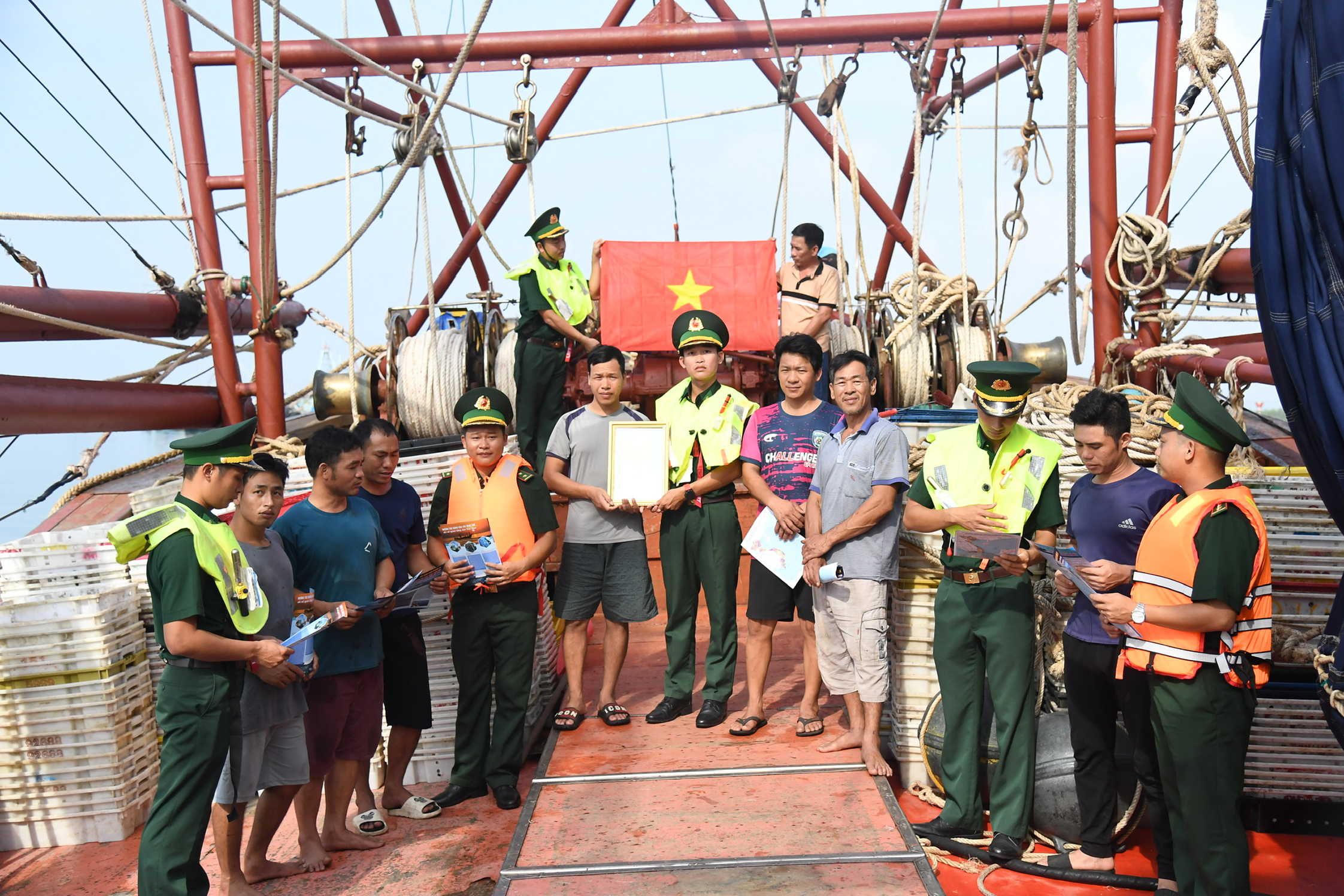 | Hải đoàn Biên phòng 18 tặng cờ Tổ quốc, ảnh Bác Hồ và bản đồ phân vùng tuyến khai thác hải sản trong vùng biển Việt Nam cho ngư dân. |