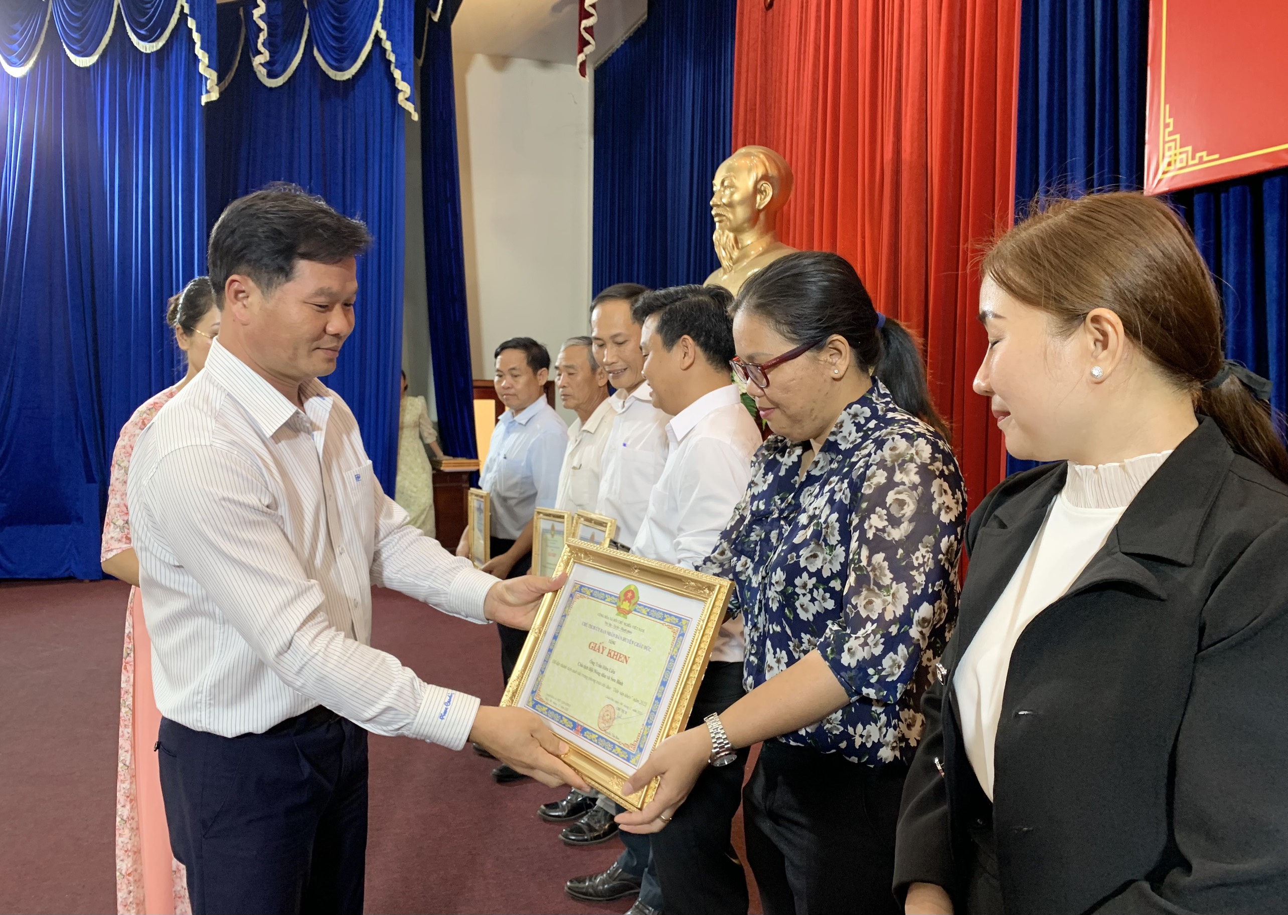 | Ông Lê Thanh Liêm, Phó Bí thư Thường trực Huyện ủy Châu Đức trao giấy khen cho các cá nhân và tập thể đạt thành tích xuất sắc trong công tác dân vận. Ảnh: THÁI BÌNH. |