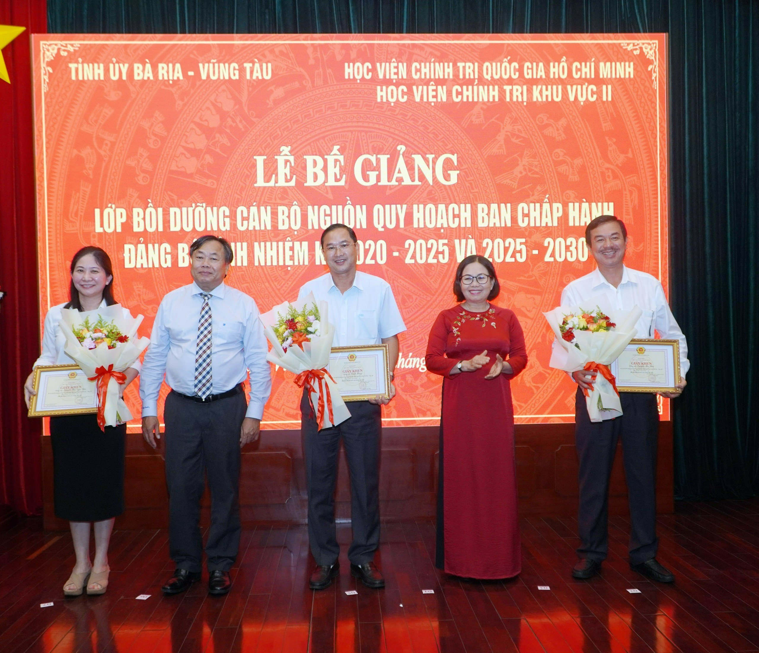| Bà Nguyễn Thị Yến, Phó Bí thư Thường trực Tỉnh ủy, Trưởng Đoàn ĐBQH tỉnh; PGS.TS Nguyễn Quốc Dũng, Giám đốc Học viện Chính trị khu vực II trao Giấy khen cho các học viên hoàn thành xuất sắc khóa học bồi dưỡng cán bộ nguồn quy hoạch BCH Đảng bộ tỉnh nhiệm kỳ 2020-2025, 2025-2030 tại lễ bế giảng ngày 22/8/2023. |