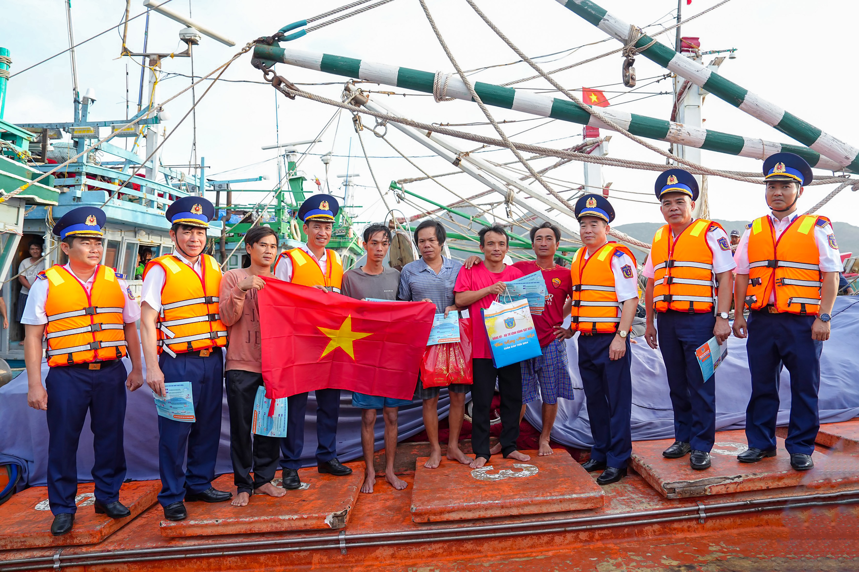 | Đoàn công tác của Bộ Tư lệnh Cảnh sát biển Việt Nam tặng cờ Tổ quốc và quà cho ngư dân huyện Côn Đảo. |