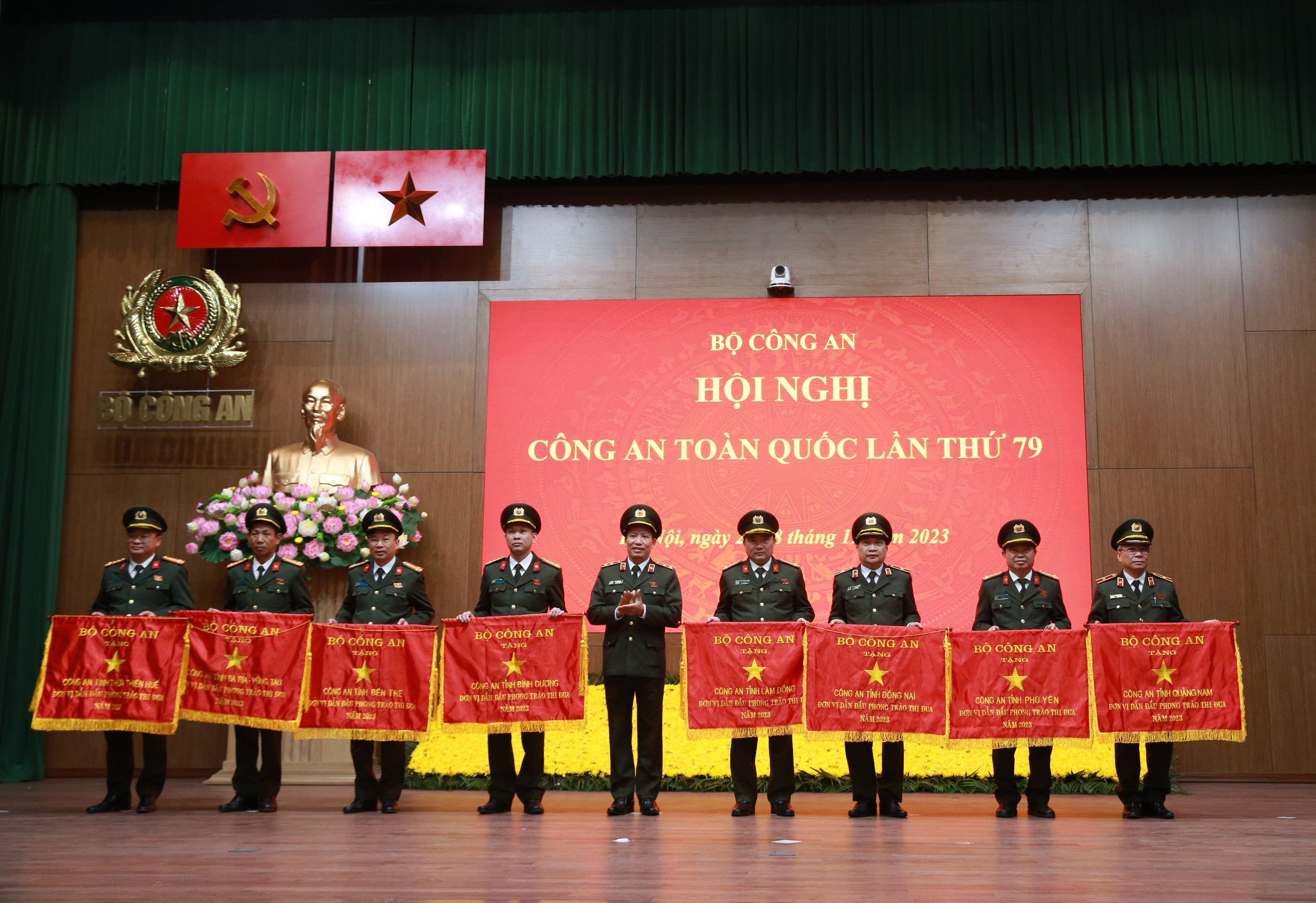 | Đại tá Bùi Văn Thảo, Giám đốc Công an tỉnh (thứ hai từ trái sang) thay mặt cán bộ, chiến sĩ công an tỉnh Bà Rịa-Vũng Tàu đón nhận Cờ thi đua của Bộ Công an năm 2023. |