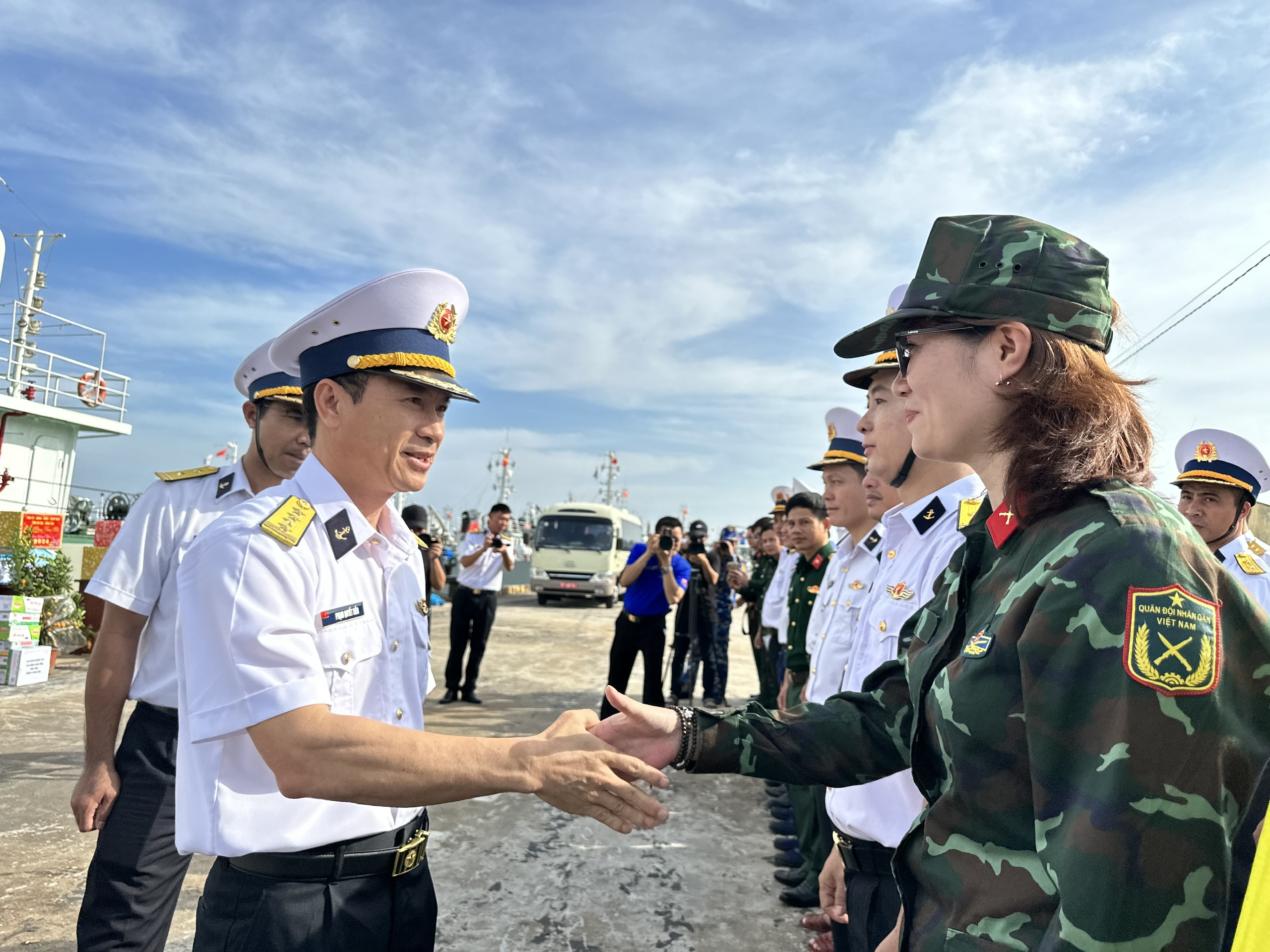 | Đại tá Phạm Quyết Tiến, Phó Tư lệnh Vùng 2 Hải quân động viên đại biểu, phóng viên trước chuyến công tác. |
