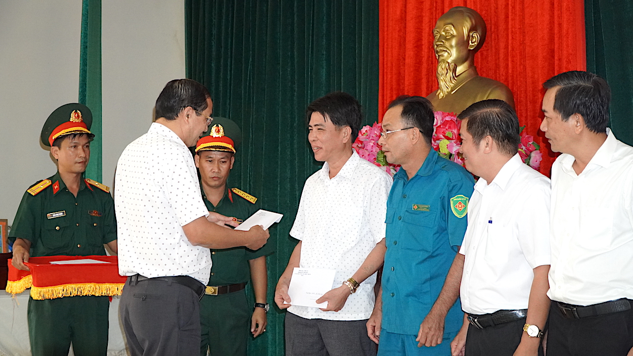 | Chủ tịch UBND huyện Châu Đức Nguyễn Tấn Bản trao quyết định giao chỉ tiêu gọi công dân nhập ngũ cho các xã, thị trấn. |