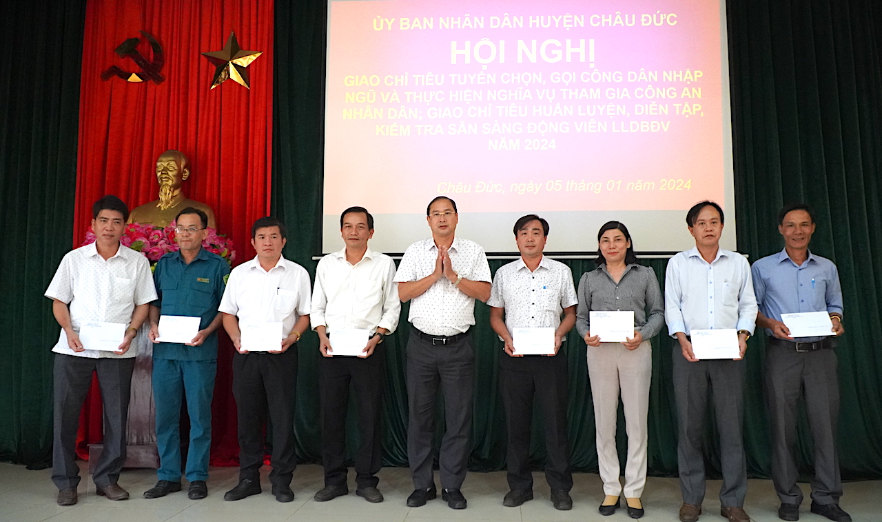 Chiều 5/1, Hội đồng NVQS huyện Châu Đức tổ chức hội nghị giao chỉ tiêu tuyển chọn, gọi công dân nhập ngũ và thực hiện nghĩa vụ tham gia Công an nhân dân; giao chỉ tiêu huấn luyện, diễn tập, kiểm tra sẵn sàng động viên lực lượng dự bị động viên năm 2024.