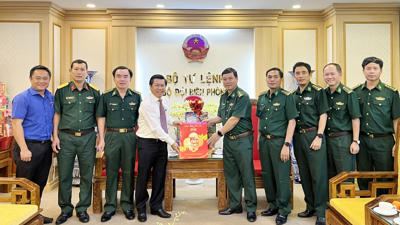 | Ông Nguyễn Văn Xinh, Ủy viên Ban Thường vụ Tỉnh ủy, Trưởng Ban Tuyên giáo Tỉnh ủy thăm, tặng quà Bộ Tư lệnh Bộ đội Biên phòng (phía Nam). ẢNH: TRẦN TIẾN |