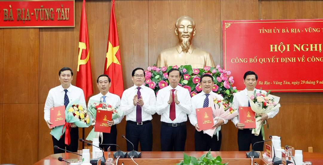 | Ông Phạm Viết Thanh, Ủy viên Trung ương Đảng, Bí thư Tỉnh ủy, Chủ tịch HĐND tỉnh; ông Nguyễn Văn Thọ, Chủ tịch UBND tỉnh trao quyết định và hoa chúc mừng 4 cán bộ đảm nhận chức vụ mới tại TP. Bà Rịa, huyện Long Điền, Đất Đỏ và LĐLĐ tỉnh, tại hội nghị công bố các quyết định về công tác cán bộ ngày 29/9/2022. Ảnh: PHÚ XUÂN |