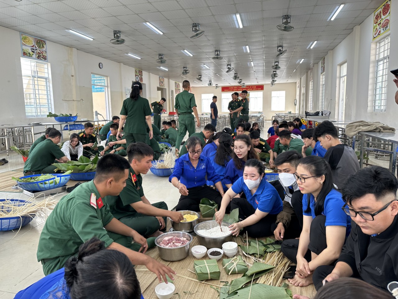 | Cán bộ, chiến sĩ Trung đoàn Minh Đạm phối hợp với Đoàn thanh niên các địa phương tại huyện Long Điền gói bánh chưng, bánh tét trong Chương trình Tết quân dân. |