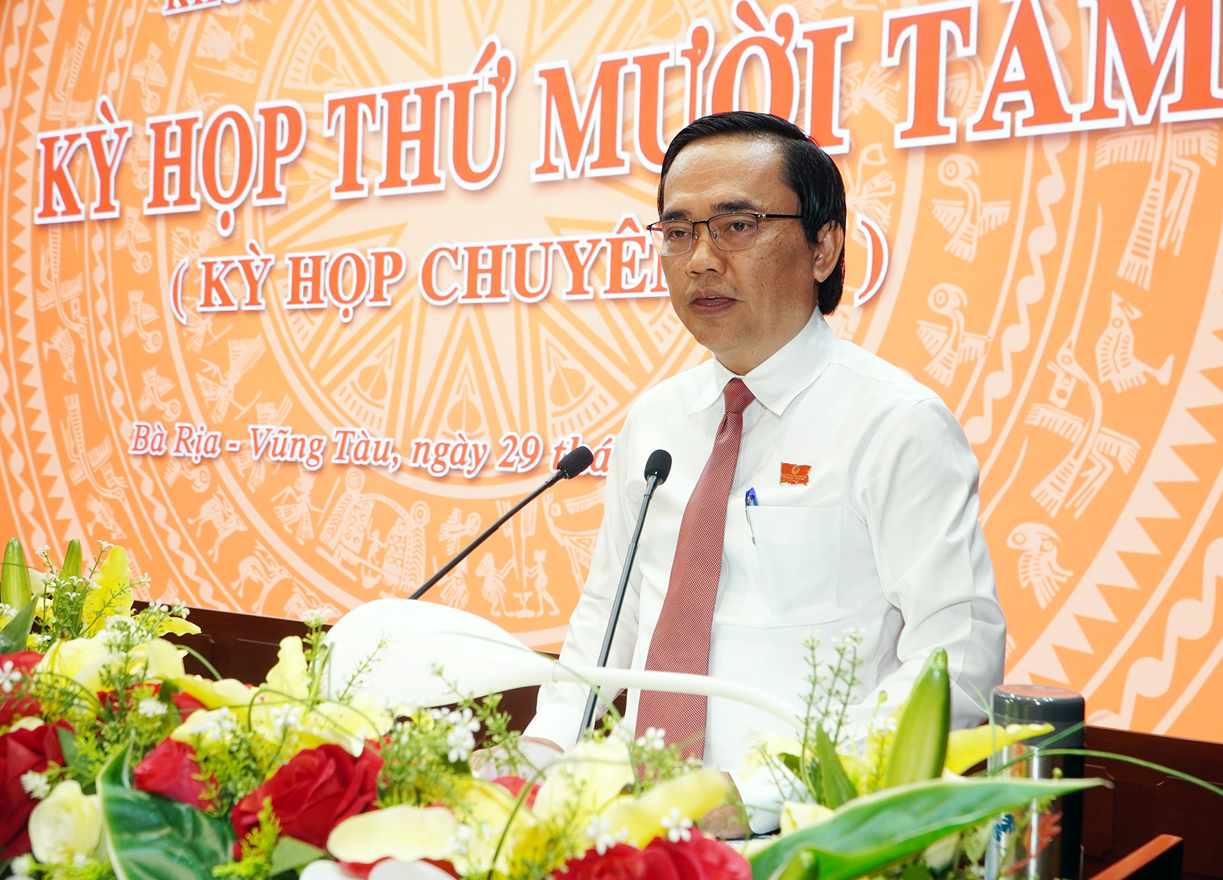 | Ông Lê Ngọc Khánh, Phó Chủ tịch UBND tỉnh trình bày tờ trình của UBND tỉnh đề xuất chủ trương đầu tư dự án. |