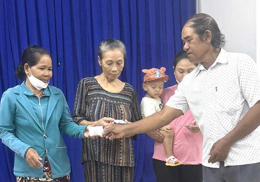 | Bí thư Chi bộ KP.Vinh Thanh Đào Văn Giả trao thẻ BHYT đến bà con khó khăn. |