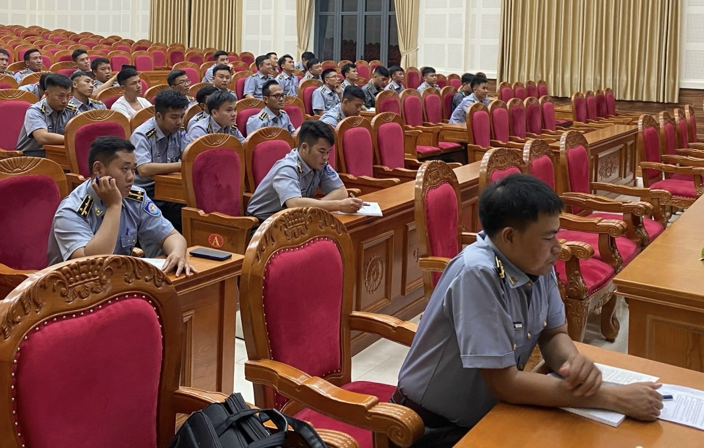 | Cán bộ, nhân viên của Chi đội Kiểm ngư số 2 được giới thiệu các từ vựng tiếng Anh về các hoạt động của kiểm ngư trên biển. |